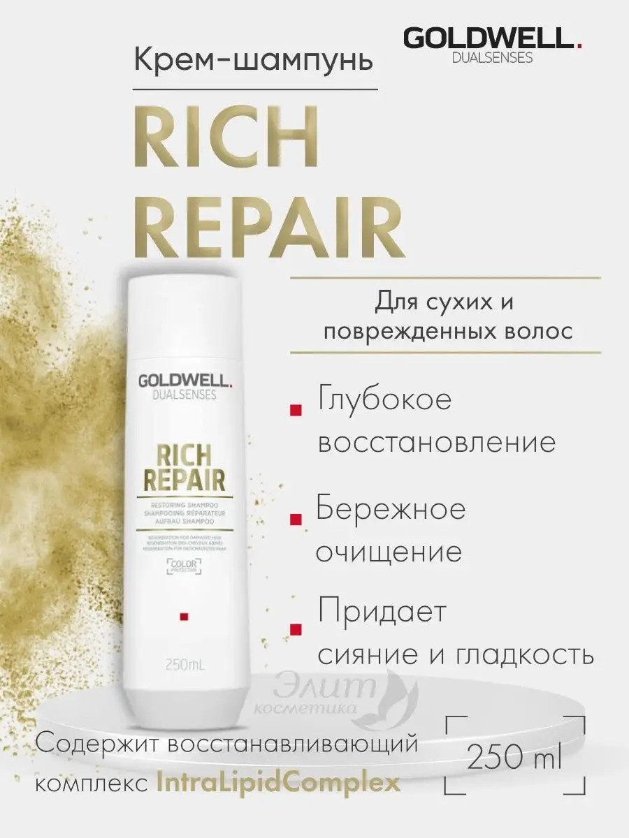Goldwell Dualsenses Rich Repair Shampoo - Cream shampoo for dry and damaged hair, 250 ml. What it does: Rich Repair shampoos gently cleanse hair, giving it strength and protecting it from damage. This shampoo is designed to gently cleanse hair with a restorative effect. What it does: The Repair System with pashmina silk proteins, combined with instant-action microfluidic technology, cares for color-treated hair that requires special attention and adds shine, allowing you to immediately see and feel the results. How to use: Apply to damp hair, gently emulsify until lather forms, then rinse thoroughly with water. Use with other Rich Repair hair care products to ensure optimal nourishing care and a restorative effect.