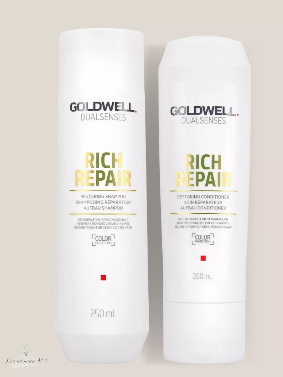 Профессиональный набор для поврежденных волос от Goldwell отлично позаботится о сохранности структурной целостности, волосы напитаются натуральными природными компонентами и будут иметь здоровый, ухоженный вид. Состав: комплекс масел, который интенсивно увлажняет и питает волосы, наполняя их вереницей полезных микроэлементов. Восстанавливающие Шампунь и Кондиционер Rich Repair Restoring для ломких и окрашенных волос содержит комплекс micro PROtec с шелковыми протеинами пашмины в сочетании с технологией микро флюидов мгновенного воздействия ухаживает за требующими особого внимания окрашенными волосами и придает блеск, позволяя мгновенно увидеть и ощутит результат. Бережно очищает и ухаживает за волосами, заметно усиливает здоровый блеск, гладкость и шелковистость. Средство для волос мягкое, как родниковая вода, благодаря уникальной формуле оно моментально распутывает проблемные непослушные локоны, дарит им феноменальную гладкость, мягкость, эластичность. Продукты подходят как для профессионального применения в салоне, так и в домашних условиях. Чтобы добиться максимального эффекта от использования, стилисты рекомендуют пользоваться всей линейкой. Увлажняющие шампунь и кондиционер помогут не только получить привлекательный и ухоженный внешний вид волосам, но и сохранить его надолго. Состав не вызывает аллергических реакций, раздражений и шелушений, имеет комфортную и экономичную в применении консистенцию, приятный ненавязчивый аромат, который остается нежным шлейфом на волосах или коже на несколько часов. Предназначено для женщин и мужчин, которые хотят выглядеть стильно и ухоженно, может стать прекрасным подарком маме, подруге, любимой на день рождения, 8 марта, новый год. Рекомендуется использовать данный набор регулярно, а для достижения максимального эффекта используйте совместно с маской и сывороткой для волос Goldwell DualSenses Rich Repair Restoring.