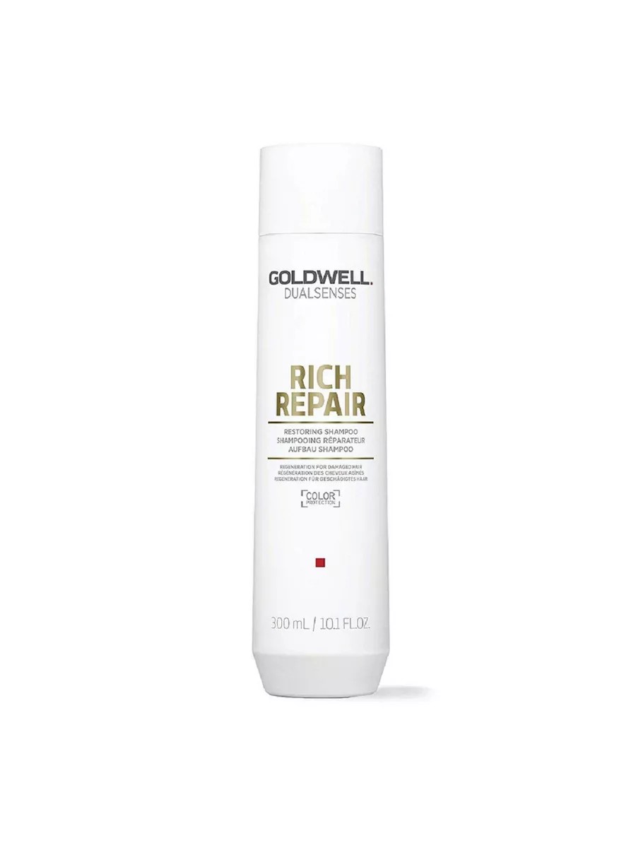 Goldwell Dualsenses Rich Repair Shampoo is used to care for dry, weakened, and damaged hair.