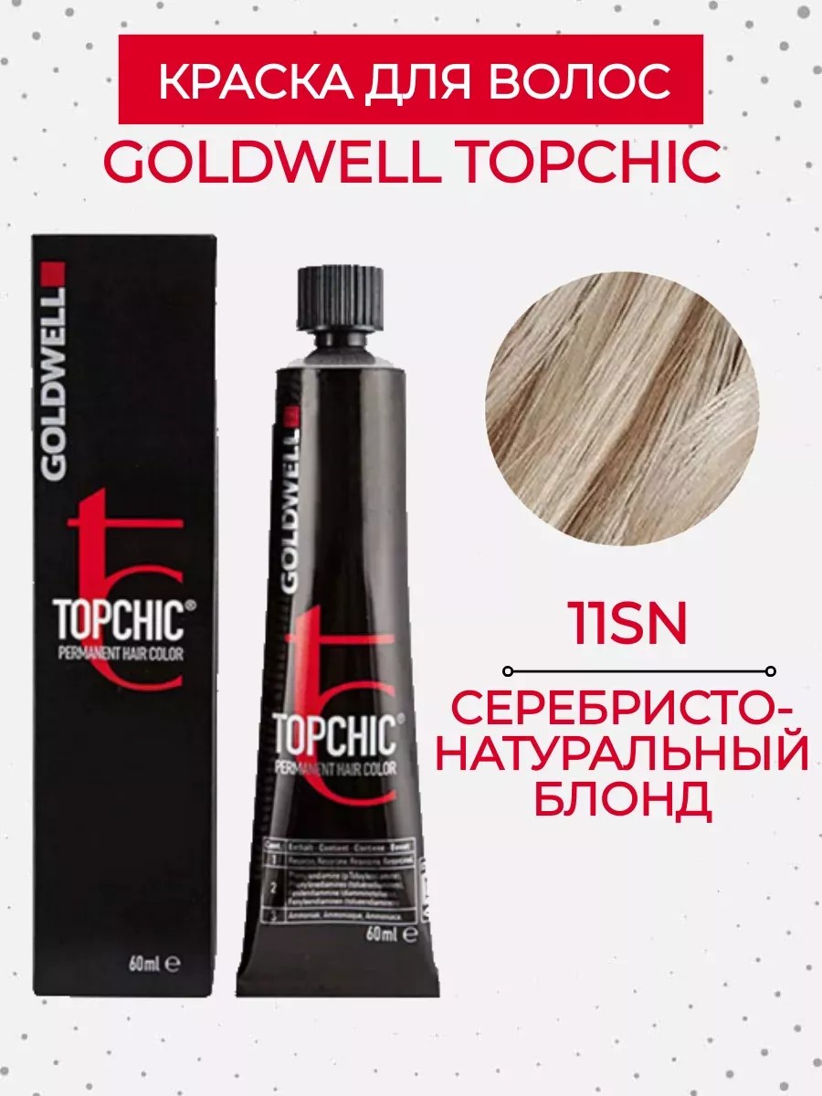 Long-lasting professional cream hair dye - Goldwell Topchic Hair Color Coloration 11SN SILVER-NATURAL BLONDE. Goldwell Topchic - long-lasting coloring in classic and extraordinary shades. 100% gray coverage, stunning shine, and a unique play of tones and undertones. This series of products is one of the most popular among professional colorists. Depending on the chosen oxide, you can achieve hair lightening by 1-4 tones without prior bleaching. After coloring with professional ammonia-based Goldwell Topchic dyes, a first-class result is guaranteed: Natural softness; 100% gray coverage; Deep, stunningly uniform color; 8 weeks of color vibrancy; Smoothness and elasticity; Luxurious shine. Directions: Mix permanent hair color with oxide 1:1. Leave on for up to 30 minutes on roots; for natural hair, leave on for 20-25 minutes on roots and 5-10 minutes on lengths. Oxide is purchased separately. For post-color care, use a mask and Goldwell shampoo. Beauty with Goldwell hair cosmetics will save the world!