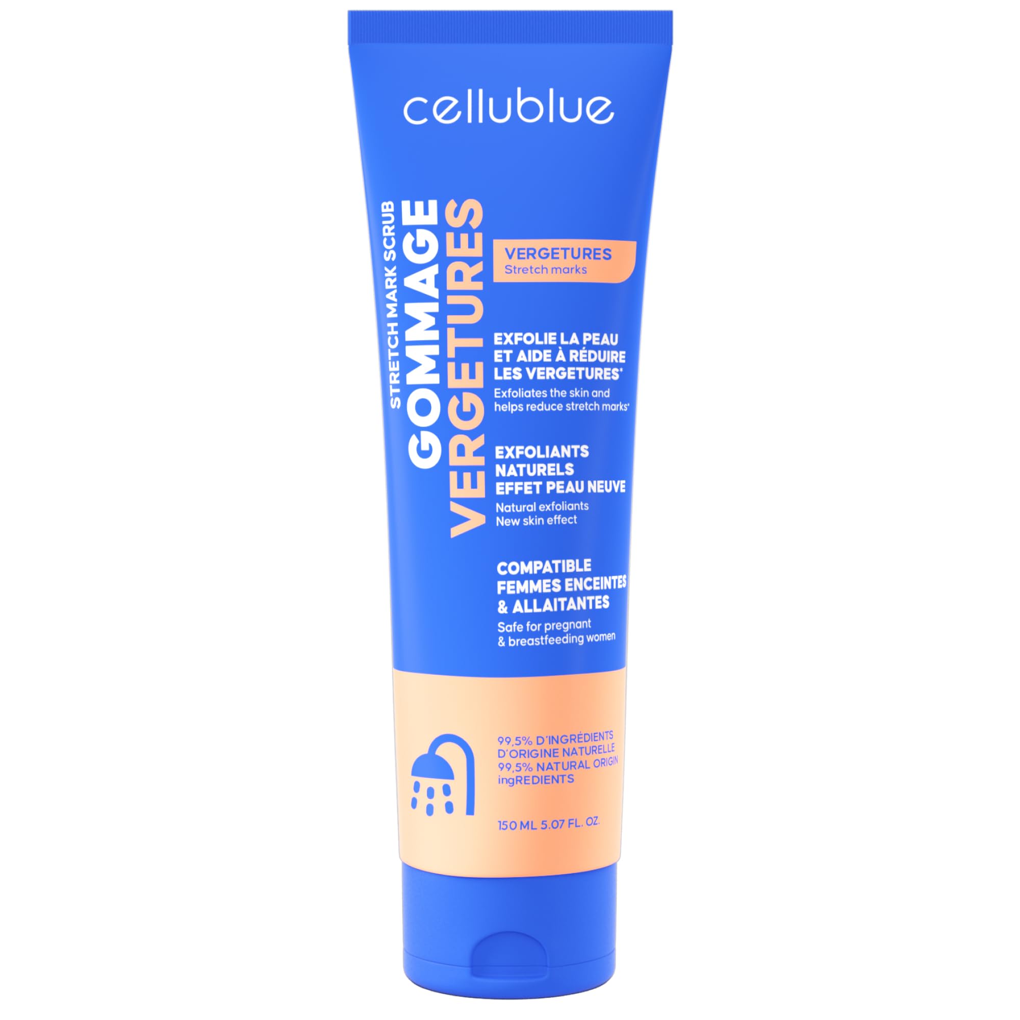 : Treat your skin to expert exfoliation with Cellublue Stretch Mark Scrub, formulated with 99 naturally derived ingredients. Its secret? A gentle exfoliating complex (apricot grains, rice powder, bamboo extract) that removes dead skin cells and prepares your skin to better absorb your other stretch mark treatments. The result: visibly smoother skin from the first use, and a gradual improvement in the appearance of stretch marks over the weeks. Thanks to its creamy texture that transforms into a foam in the shower, this scrub makes exfoliation an ultra-pleasant experience. Massage in circular motions to stimulate microcirculation and promote cell regeneration: your weakened areas gradually regain elasticity. Enriched with mango butter, it provides nourishment and comfort without irritating sensitive skin. Whether your stretch marks are recent or already noticeable, this treatment fits perfectly into a complete routine: after rinsing, apply a targeted cream or oil to prolong the smoothing effect. Tested and approved, Cellublue Stretch Mark Scrub is suitable for pregnant and breastfeeding women, thanks to its absence of essential oils. Opt for targeted exfoliation 2 to 3 times a week and rediscover softer, more even skin, better prepared to combat the appearance of stretch marks. Embrace the quality of Cellublue, a French brand with over 12 years of expertise, acclaimed by thousands of women. Treat yourself while taking care of your body with a simple, natural, and effective beauty step. Ingredients: AQUA, CAPRYLYL CAPRYL GLUCOSIDE, GLYCERIN, BAMBUSA ARUNDINACEA STEM EXTRACT, PRUNUS ARMENIACA SEED POWDER, XANTHAN GUM, PARFUM, SODIUM BENZOATE, MANGIFERA INDICA SEED BUTTER, TRITICUM VULGARE GERM OIL, CITRIC ACID, POTASSIUM SORBATE. Directions for use: Massage in circular motions to stimulate microcirculation and promote cell regeneration: your weakened areas gradually regain elasticity. Enriched with mango butter, it provides nourishment and comfort without irritating sensitive skin. Opt for targeted exfoliation 2 to 3 times a week and rediscover softer, more even-toned skin, better prepared to combat the appearance of stretch marks. Safety Warning: For body use only. If you have sensitive skin, we recommend always performing a patch test on a small area before regular use. Suitable for pregnant or breastfeeding women. Results may vary from person to person. See more99 NATURAL ACTIVE INGREDIENTS. Apricot kernels, rice powder, and mango butter work together to soften skin. Their formula is suitable even for sensitive skin, and is free of essential oils. Each application nourishes and prepares the skin for your other targeted treatments. FRENCH BRAND EXPERTS FOR 12 YEARS. Cellublue is renowned for its innovative and natural formulas, acclaimed by over a million users. Its expertise ensures effectiveness and ease of use. Benefit from a complete range to beautify your skin day after day. A PLEASANT FOAMY MOMENT. Its creamy texture transforms into a foam in the shower, making exfoliation a pleasant experience. Circular movements optimize the removal of impurities. In just a few steps, skin regains suppleness and comfort. PREGNANCY SAFE. Free from essential oils, this scrub is suitable for pregnant and breastfeeding women. It can be safely incorporated into your routine to preserve skin elasticity. Its gradual action helps to diminish the appearance of stretch marks. GENTLE EXFOLIATION. This scrub gently removes dead skin cells to reveal smoother skin. It stimulates microcirculation to better target stretch marks. Results are noticeable from the first use.Description du produit Offrez à votre peau une exfoliation experte grâce au Gommage Vergetures Cellublue, formulé à 99 d'ingrédients d'origine naturelle. Son secret ? Un complexe exfoliant doux (grains d'abricot, poudre de riz, extrait de bambou) qui élimine les cellules mortes et prépare votre peau à mieux assimiler vos autres soins anti-vergetures. Résultat : une peau visiblement plus lisse dès la première utilisation, et une amélioration progressive de l'aspect des vergetures au fil des semaines. Grâce à sa texture onctueuse qui se transforme en mousse sous la douche, ce gommage rend l'instant exfoliant ultra-plaisant. Massez en mouvements circulaires pour stimuler la microcirculation et favoriser la régénération cellulaire : vos zones fragilisées gagnent peu à peu en élasticité. Enrichi en beurre de mangue, il apporte nutrition et confort, sans irriter les peaux sensibles. Que vos vergetures soient récentes ou déjà marquées, ce soin s'intègre parfaitement à une routine complète : après le rinçage, appliquez une crème ou une huile ciblée pour prolonger l'effet lissant. Testé et approuvé, le Gommage Vergetures Cellublue convient aux femmes enceintes et allaitantes, grâce à son absence d'huiles essentielles. Optez pour une exfoliation ciblée 2 à 3 fois par semaine et retrouvez une peau plus douce, plus uniforme et mieux préparée à contrer l'apparition des vergetures. Adoptez la qualité Cellublue, marque française experte depuis plus de 12 ans, plébiscitée par des milliers de femmes. Faites-vous plaisir tout en prenant soin de votre corps, avec un geste beauté simple, naturel et efficace. Ingrédients AQUA, CAPRYLYL CAPRYL GLUCOSIDE, GLYCERIN, BAMBUSA ARUNDINACEA STEM EXTRACT, PRUNUS ARMENIACA SEED POWDER, XANTHAN GUM, PARFUM, SODIUM BENZOATE, MANGIFERA INDICA SEED BUTTER, TRITICUM VULGARE GERM OIL, CITRIC ACID, POTASSIUM SORBATE. P.when('A').execute(function(A) { A.on('a:expander:toggle_description:toggle:collapse', function(data) { window.scroll(0, data.expander. expander[0].offsetTop-100) }) }) Mode d'emploi Massez en mouvements circulaires pour stimuler la microcirculation et favoriser la régénération cellulaire: vos zones fragilisées gagnent peu à peu en élasticité. Enrichi en beurre de mangue, il apporte nutrition et confort, sans irriter les peaux sensibles. Optez pour une exfoliation cib
