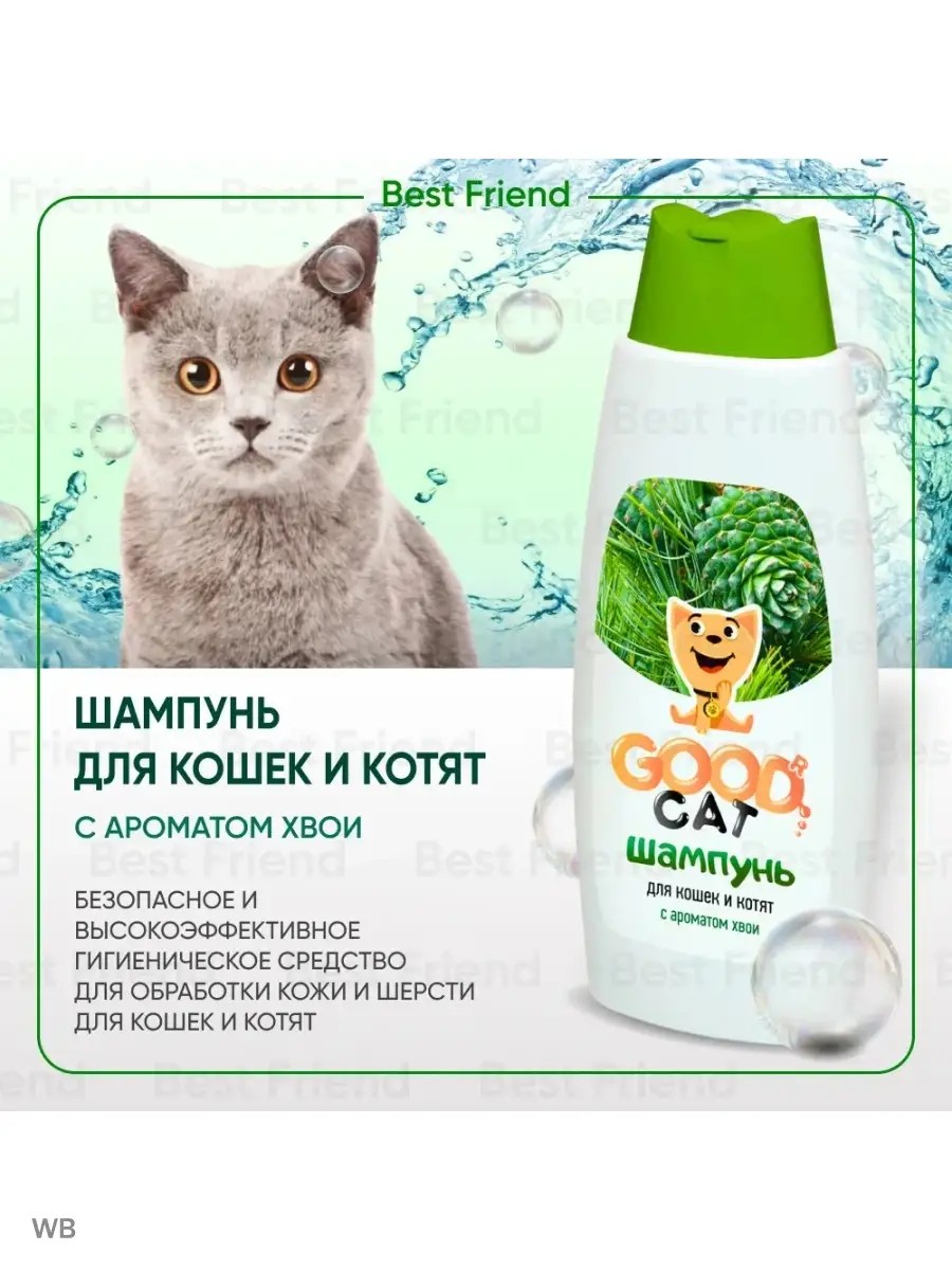 Шампунь для кошек Good Cat с хвойным запахом, предназначен для ухода за шерстью всех пород кошек и котят, содержит мягкий моющий комплекс, который обладает отличными очищающими свойствами. Способствует питанию и увлажнению шерсти, предотвращает спутывание, легко смывается, оставляя приятный аромат сосны и ели. Содержание в шампуне мягких моющих компонентов на натуральной основе обеспечивает глубокое очищение шерсти, не нарушая защитные свойства кожи. Шампунь не раздражает слизистую оболочку глаз, не содержит красителей.