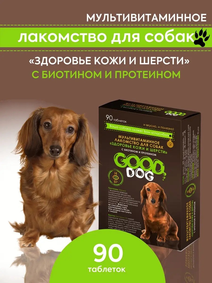 Good Dog's high-quality multivitamin treats are a tasty and healthy treat that will complement your pet's daily diet. - Proteins are vital nutrients necessary for growth and normal functioning of the body, facilitating the absorption of other nutrients. Animals cannot synthesize proteins on their own; they must come from food. Biotin (vitamin H) is essential for the nutrition of the skin and coat. It promotes growth, fluffiness, silkiness, and vibrant color of animal fur, prevents skin inflammation, and makes it resistant to microdamage. A biotin deficiency can cause hair loss, itching, brittle hair, and claws. - Feeding recommendations: Can be used with any diet (natural food, dry food, etc.). - Directions: 5-6 tablets per day. During physical exertion and stress, during the rehabilitation period, and for pregnant and lactating animals, the dose can be increased by 1.5-2 times.