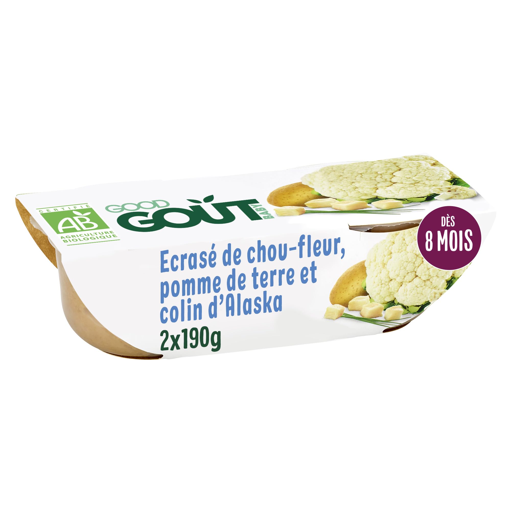 GOOD GOÛT - Écrasé De Chou-Fleur, Pomme De Terre Et Colin D'Alaska - Plat Cuisiné Pour Bébé - Dès 8 Mois - Purée Moulinée - Bols Micro-Ondables - 2x190g (L'emballage peut varier) chou fleur colin 190 g (Lot de 2)