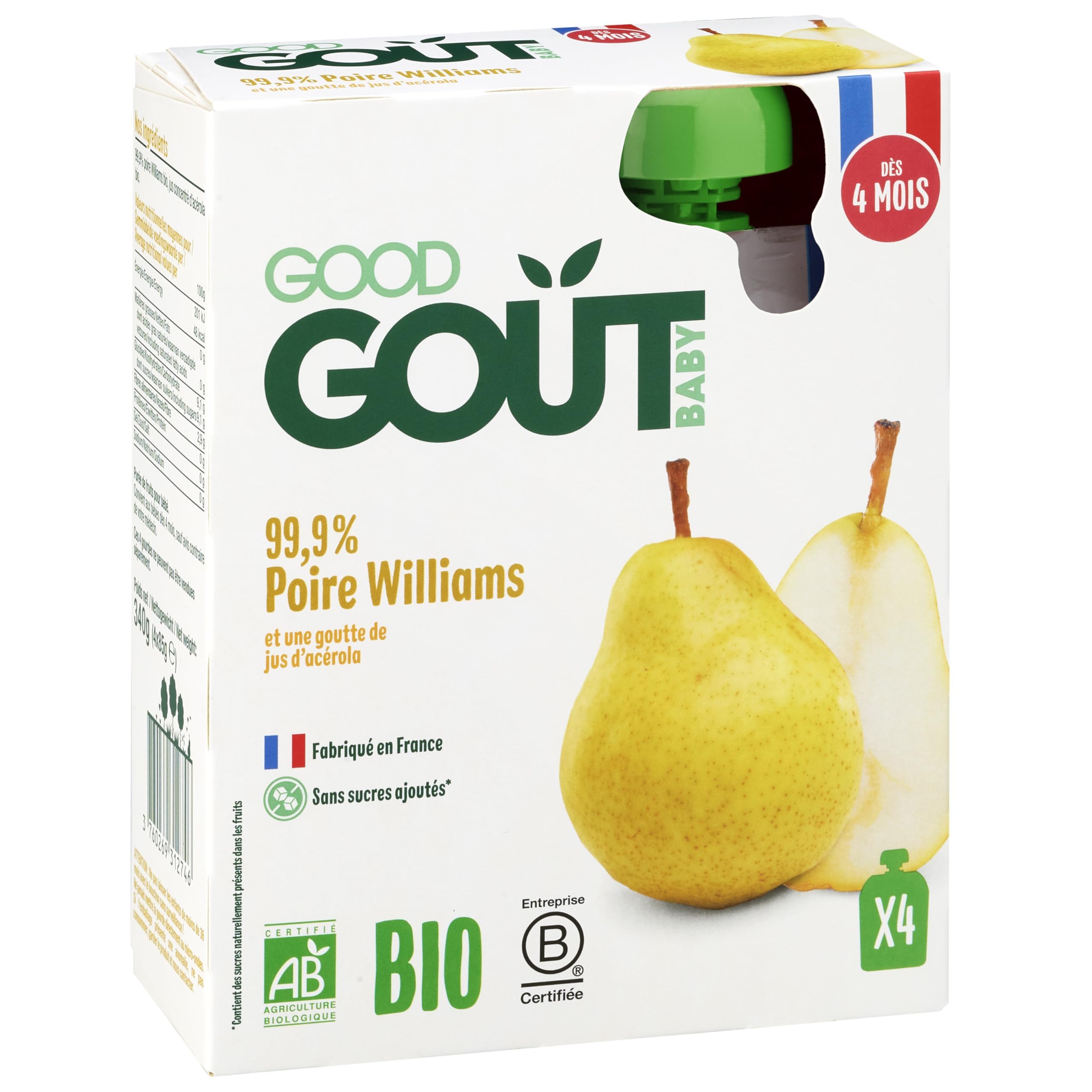 : Offering healthy and flavorful foods, Good Goût is a brand specializing in creating delicious recipes for babies. From ready-made meals and vegetable purees to blended and compote-style pouches, our fruit pouches and gourmet biscuits share a common feature: a short ingredient list and no palm oil. At Good Goût, we focus on the essentials to bring back the true taste of fruits and vegetables. Designed for your children's enjoyment, Good Goût products are made in accordance with organic farming regulations. Healthy treats that preserve the quality of the soil, air, water, and natural ecosystems. By choosing Good Goût, you are giving your children high-quality, healthy, and sustainable products. Together, let's create a better future, one bite at a time. In a compote-like format, Good Goût pouches contain authentic flavor with smooth and velvety fruit purees to offer your child, from 4 months old, a tasty breakfast or a delicious snack. Contains naturally occurring sugars. In accordance with organic farming regulations. Ingredients: 99.9 organic Williams pear, organic concentrated acerola juice. Instructions: Shake. Pour into a bowl or directly onto a spoon. Enjoy! Safety Warning: CAUTION: Do not leave children under 36 months unattended with the cap! Never place the pouch directly in the microwave. If the packaging shows any signs of damage, do not consume the product, keep it and contact us. See more