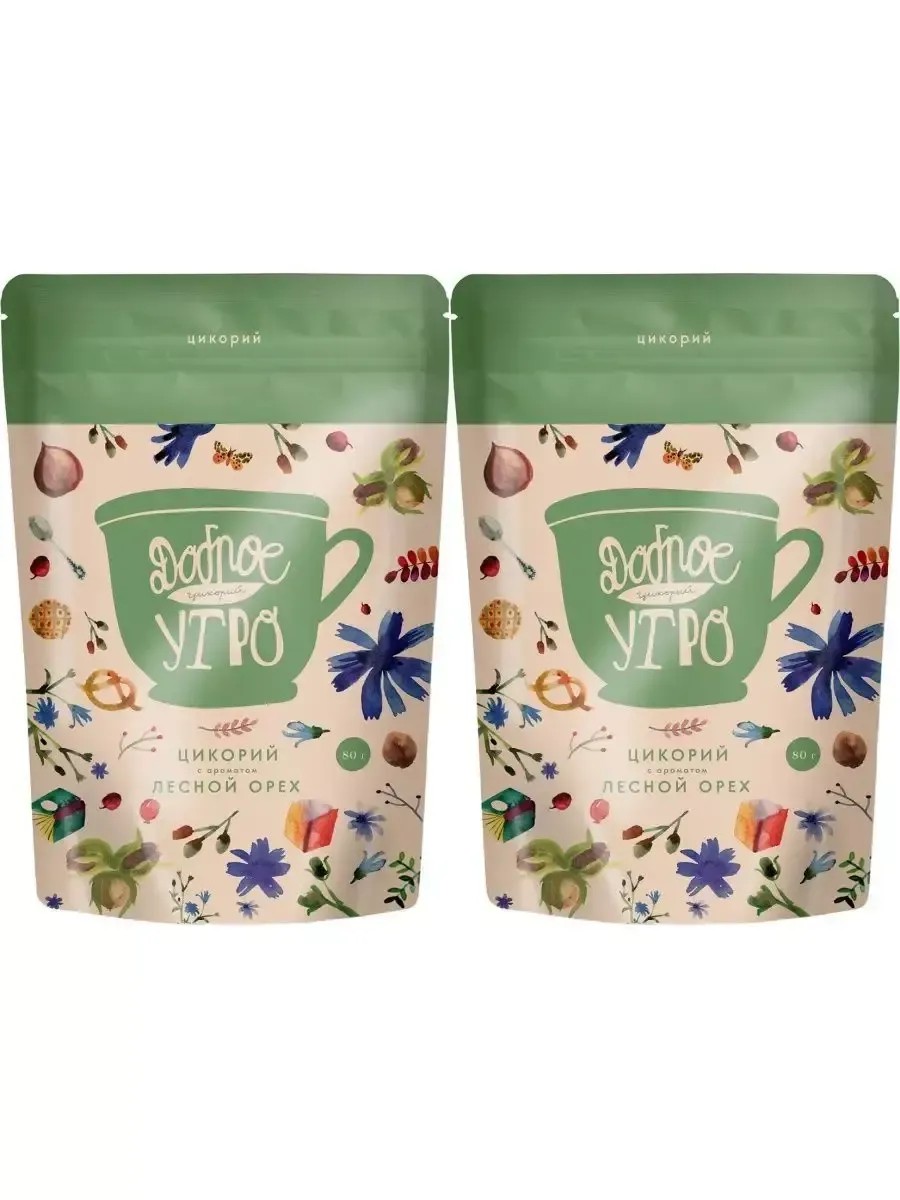 В комплекте 2 упаковки. Общий вес комплекта 160 г. Доброе утро, Цикорий натуральный растворимый порошок, Лесной орех. Роскошный ароматный напиток разбудит Вас утром и придаст бодрости вечером. А сбалансированное сочетание классического цикория и лесного ореха доставит Вам незабываемое удовольствие вкуса.