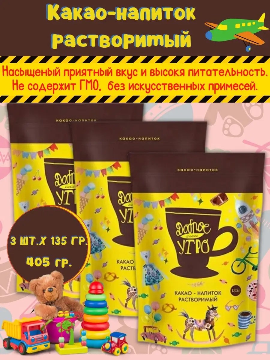 Растворимый какао-напиток торговой марки Доброе утро изготавливается на основе натуральных ингредиентов без искусственных примесей и не содержит ГМО. Он отличается насыщенным приятным вкусом и высокой питательностью, поэтому отлично подойдет для завтрака как взрослым, так и детям. Также он богат витаминами и микроэлементами, необходимыми для организма. Для приготовления какао- напитка достаточно залить несколько ложек порошка горячим молоком. Какао не просто вкусный напиток, а и очень полезный, и питательный, подходит для приготовления в домашних условиях различных кондитерских изделий. В какао много разнообразных витаминов и микроэлементов, что помогают укреплять детский иммунитет. Какао детям, не имеющим пищевой аллергии, можно давать 1–2 раза в неделю начиная с 2-х лет. Детям-аллергикам какао предлагать с осторожностью и только после трехлетнего возраста. Состав: Сахар, какао-порошок, соль.