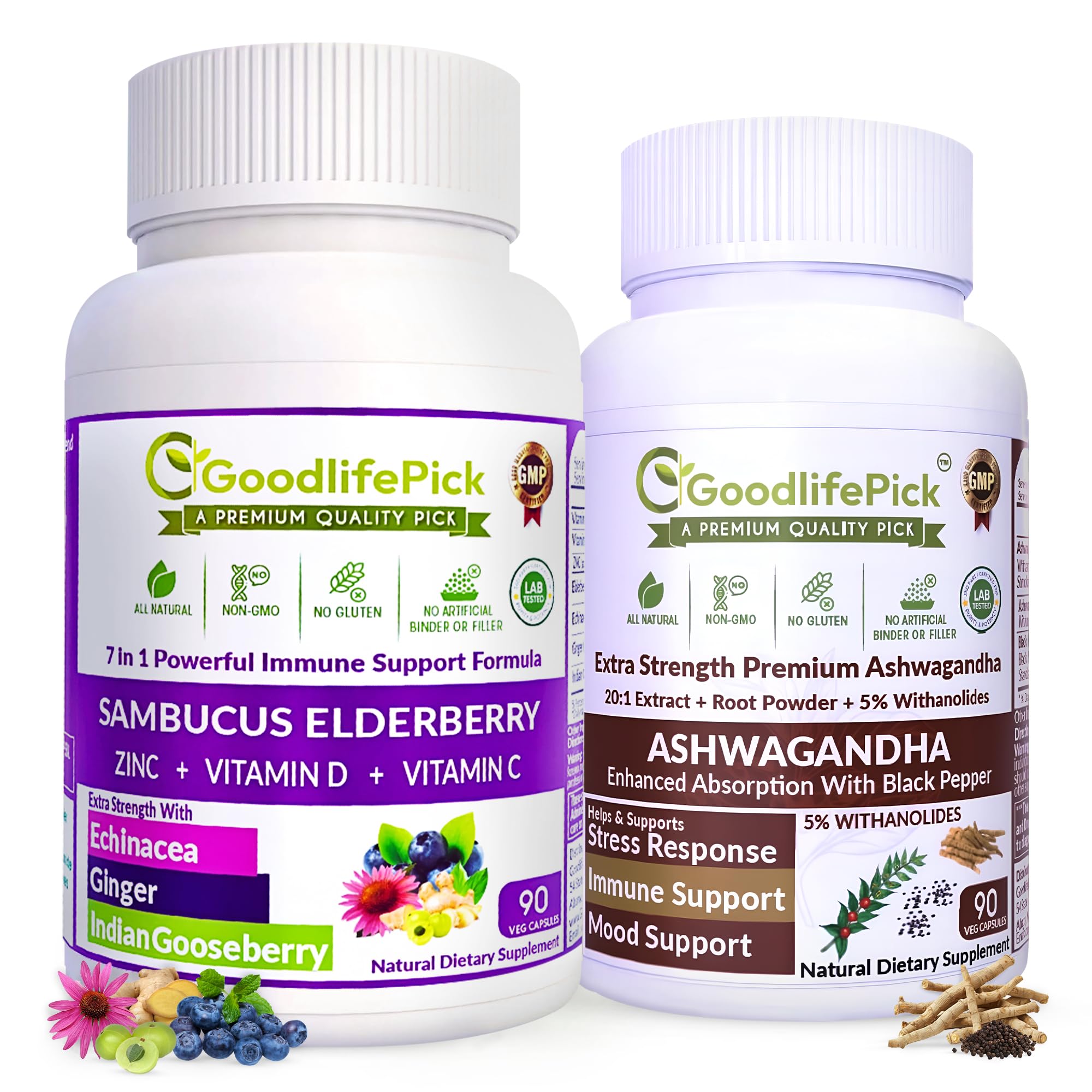 GoodlifePick 7-in-1 Elderberry & Ashwagandha Virtual Bundle 90 Veg Capsules Each Zinc Vitamins C & D Echinacea Ginger Amla All-Natural Vegan Non-GMO No Gluten No Rice Powder