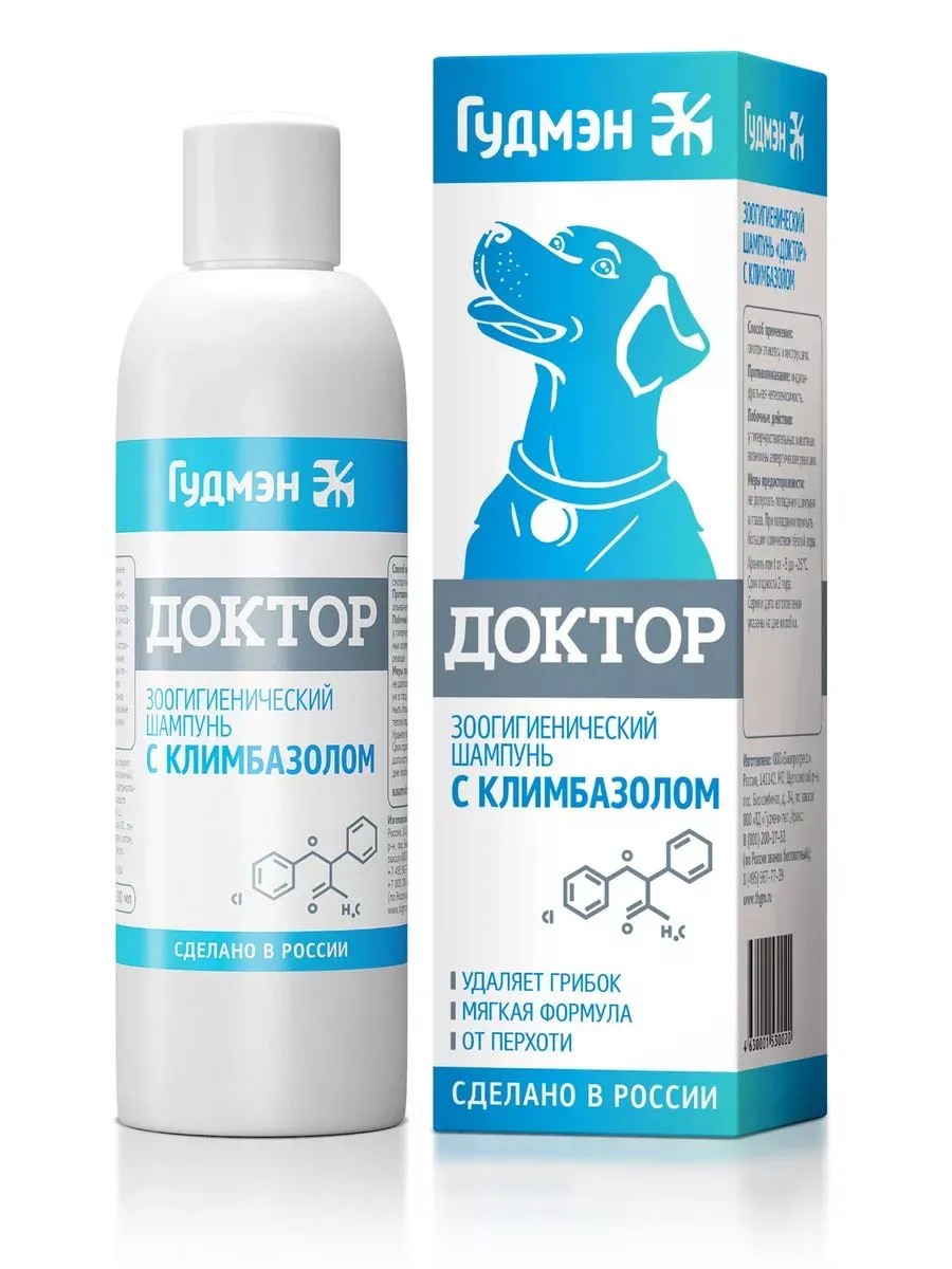 Гудмэн Шампунь Доктор для собак с климбазоло, 200 мл. Шампунь для гигиенического ухода за кожей и шерстью животных – полифункциональное средство, с мягкой моющей основой, содержащей поверхностно-активные вещества растительного происхождения, эффективно борется с дрожжеподобными грибами, очищает кожу и шерсть животного, снимает раздражение и зуд кожи, обладает дезодорирующим действием, способствует подавлению воспалительных процессов, нормализует выработку кожных секретов.