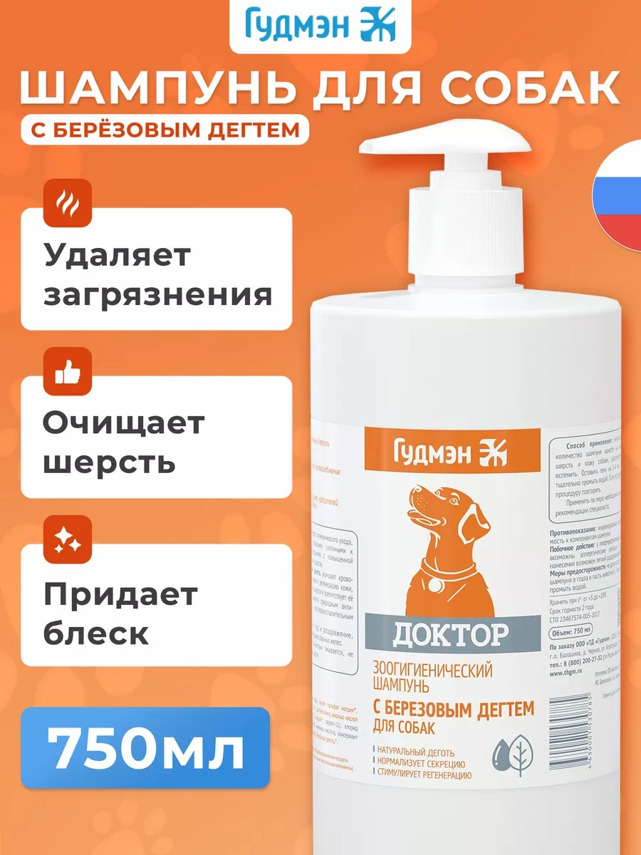 Goodman's DOCTOR shampoo for dogs with natural birch tar effectively removes dirt and epidermal debris from the coat, normalizes sebaceous gland function, stimulates metabolic processes in the skin, and regenerates damaged epidermis. Goodman shampoo leaves the coat clean, shiny, and easy to comb. Recommended for regular use on dogs and puppies of all breeds.