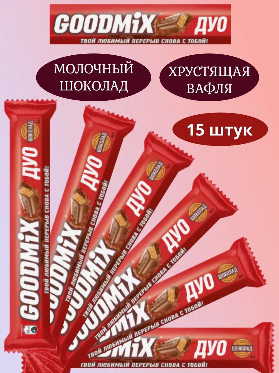 Шоколадный батончик Goodmix молочный шоколад с хрустящей вафлей Дуо Original 40 гр., 15 штук. Шоколадный батончик GOODMIX ORIGINAL с молочным шоколадом и с хрустящей вафлей от компании NESTLE.