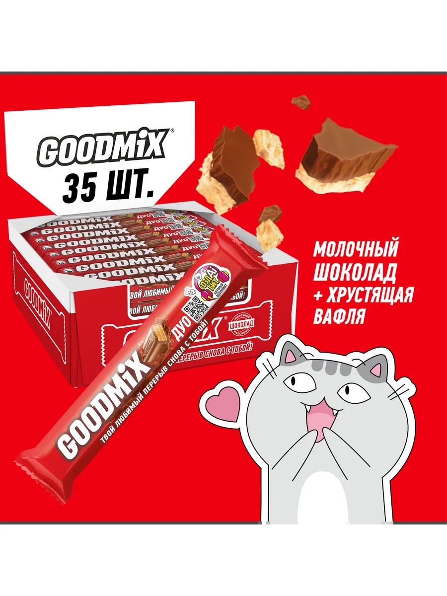 Батончик Гудмикс ориджинал в формате ДУО – это идеальный микс хрустящей вафли и нежного молочного шоколада в еще большем размере для максимального вдохновения и отличного настроения!