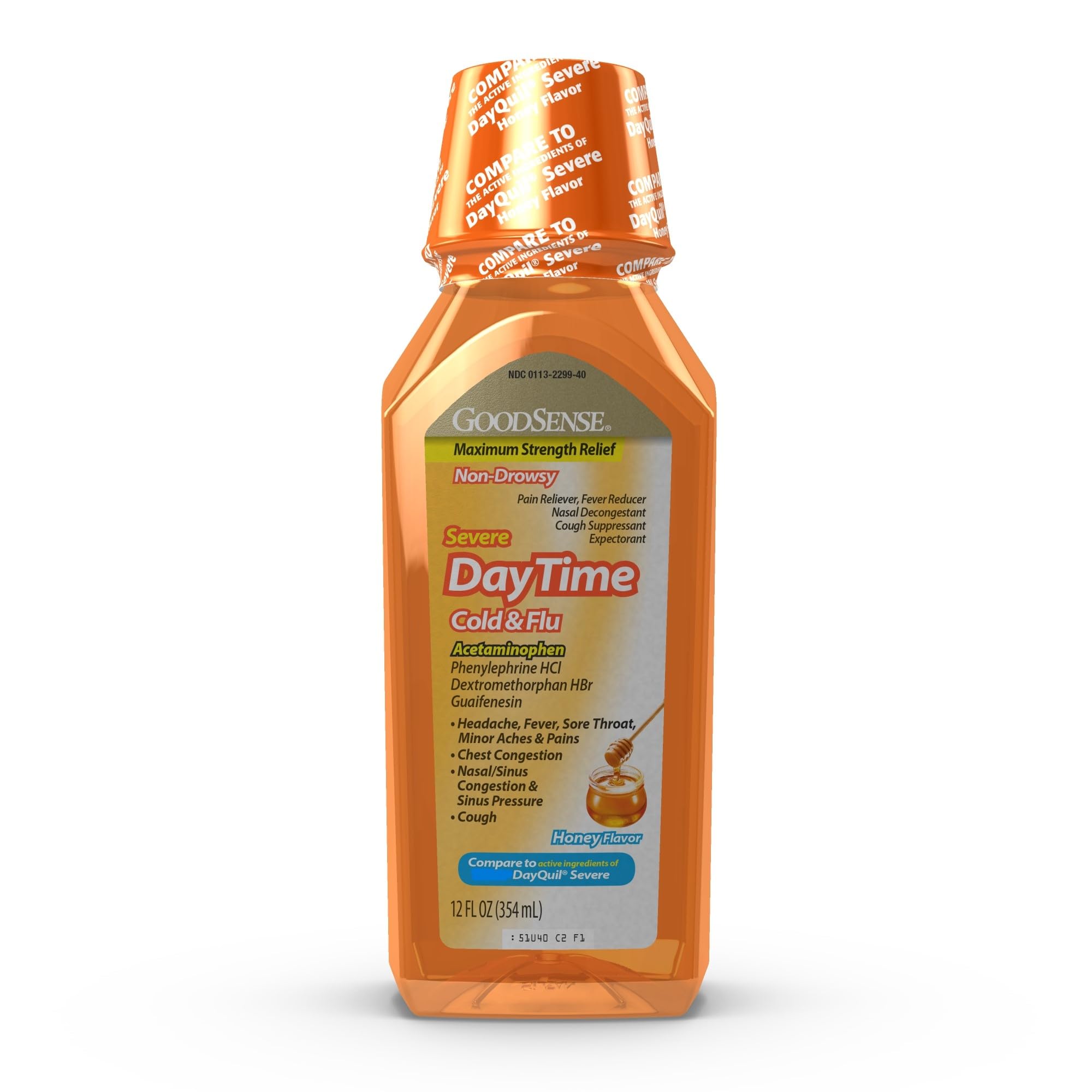 Compare to the active ingredients of Vicks DayQuil Severe Honey Flavor Cold and Flu. Calm your cough and soothe your severe cold and flu symptoms with maximum strength, non-drowsy Daytime Honey Flavor Severe Cold and Flu Relief. Each dose thins and loosens mucus while relieving severe headache, fever, sore throat, minor aches and pains, chest congestion, nasal and sinus congestion, sinus pressure and cough. In soothing honey flavor, this liquid flu, cold and cough medicine can be taken every four hours. It combines acetaminophen, a pain reliever and fever reducer guaifenesin, an expectorant phenylephrine HCl, a nasal decongestant and dextromethorphan HBr, a cough suppressant to help you feel better so you can take on the day. This product is gluten free. For children ages 6 and older.HONEY FLAVORED: Get maximum strength, multi-symptom relief with this soothing honey flavored liquid cold, flu and cough medicine. Dosage cup included. Gluten free. For ages 6 and older. MAXIMUM STRENGTH: This medicine for severe symptoms provides maximum strength relief of headache, fever, sore throat, minor aches and pains, chest congestion, nasal and sinus congestion, sinus pressure and cough also thins and loosens mucus. NON-DROWSY: Daytime Severe Honey Flavor Cold and Flu Relief is non-drowsy. Take every four hours for daytime relief of severe symptoms. MULTI-SYMPTOM RELIEF: Each dose contains a pain reliever, fever reducer, cough suppressant, expectorant and nasal decongestant to soothe your symptoms so you can take on the day. ACTIVE INGREDIENTS: Compare to the active ingredients of DayQuil Severe Honey Flavor Cold and Flu: acetaminophen, phenylephrine HCl, dextromethorphan HBr and guaifenesin.