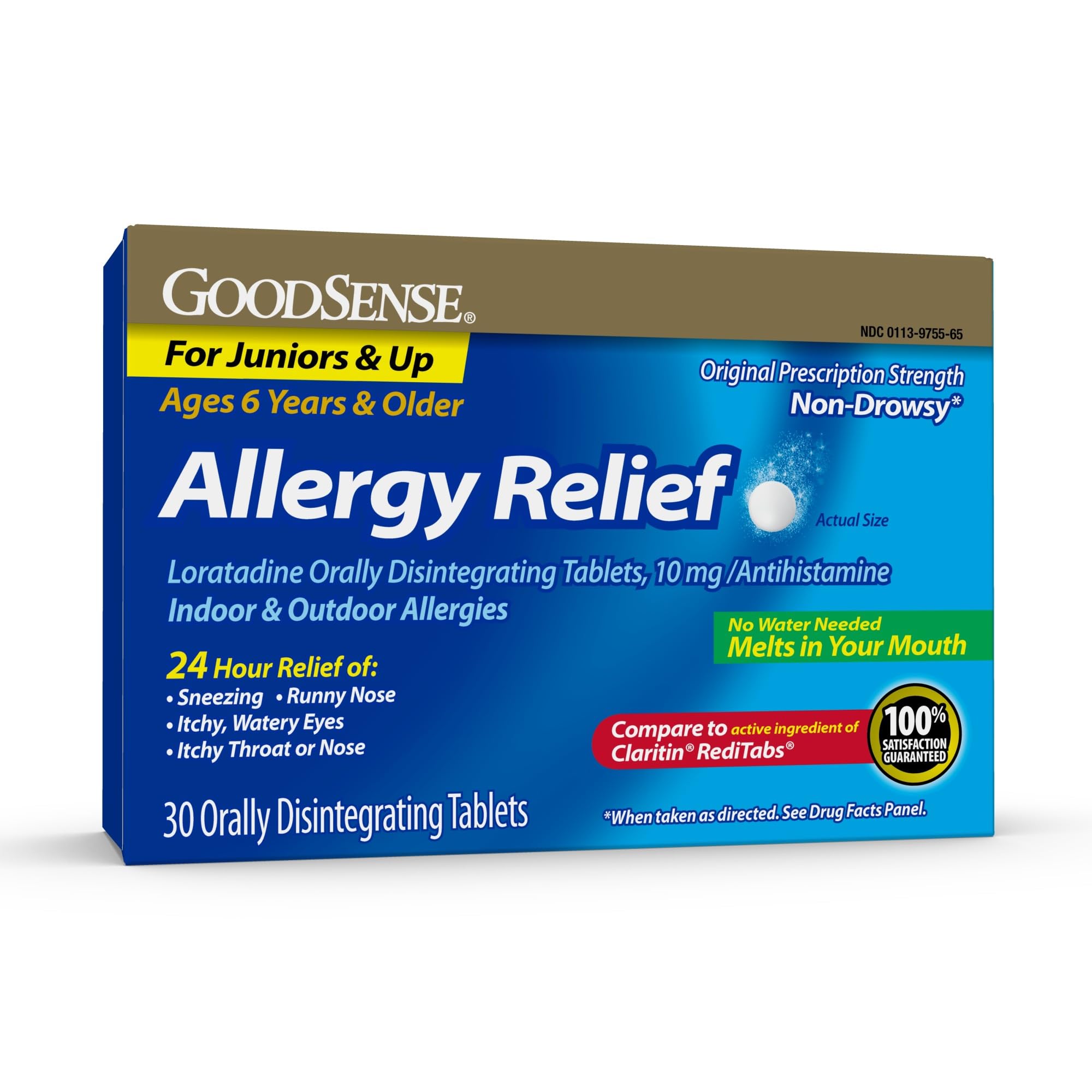 Compare to the active ingredient of Claritin RediTabs. Loratadine Orally Disintegrating Tablets, 10 mg, provide 24 hours of indoor and outdoor allergy symptom relief. No water is needed, these melt-in-your-mouth loratadine allergy tablets temporarily relieve symptoms due to hay fever or other upper respiratory allergies: sneezing runny nose itchy, watery eyes and itchy nose or throat. In original prescription strength, this allergy medicine is non-drowsy when taken as directed. See Drug Facts Panel. Each one tablet dose provides all day allergy symptom relief. Safe for adults and juniors ages 6 years and older. Gluten free.