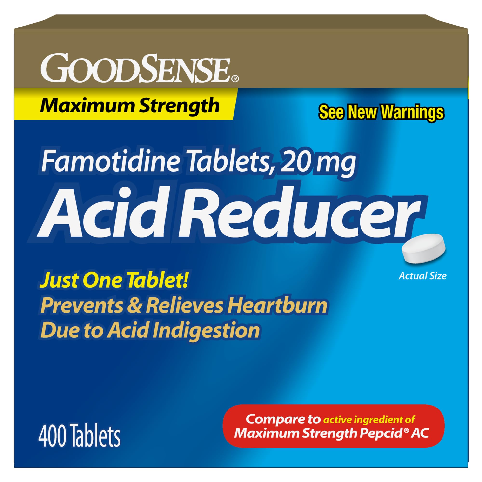 Compare to the active ingredient in Maximum Strength Pepcid AC. Just one tablet of GoodSense Maximum Strength Famotidine Tablets 20 mg prevents and relieves heartburn associated with acid indigestion brought on by eating and drinking certain foods and beverages. This gluten free heartburn medicine is intended for adults and children 12 years and over. Helps prevent meal-induced heartburn when taken at least 10-60 minutes before eating. Lasts up to 12 hours. Don't let heartburn get between you and your favorite items on the menu, when just one tablet offers maximum strength heartburn relief and prevention for acid indigestion and sour stomach.