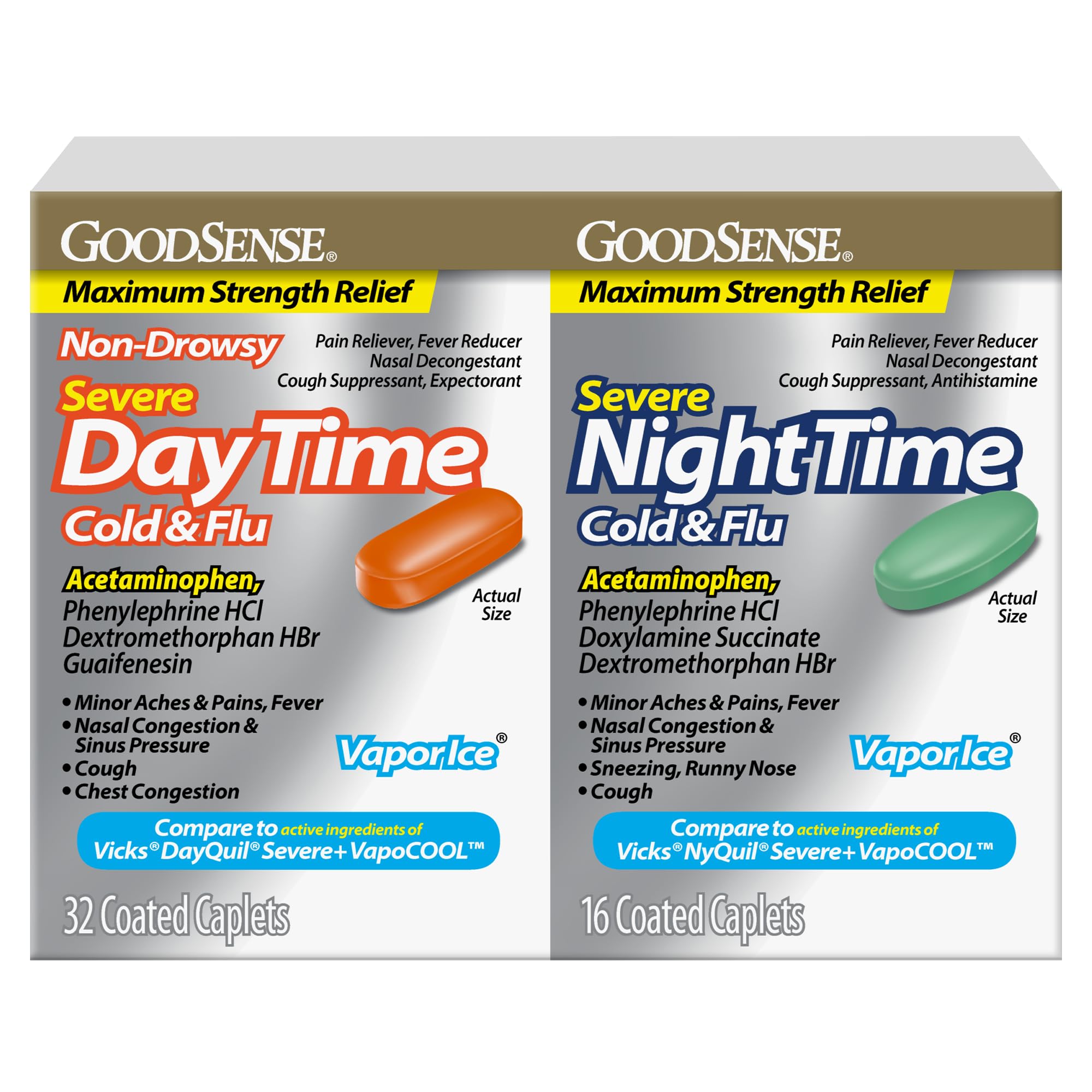 Compare to Vicks DayQuil and NyQuil Severe Plus VapoCOOL active ingredients. Cool your severe cold and flu symptoms with GoodSense Vapor Ice Daytime and Nighttime Severe Cold and Flu Coated Caplets. This combo pack gives you around-the-clock, maximum strength relief of multiple cold and flu symptoms. Non-drowsy Daytime relieves minor aches and pains, fever, nasal congestion, sinus pressure, cough and chest congestion. Nighttime relieves minor aches and pains, fever, nasal congestion, sinus pressure, sneezing, runny nose and cough. Take these gluten free caplets for multi-symptom severe cold and flu relief. This two-product combination pack is for adults and children 12 years and over.MAXIMUM STRENGTH: Get day and night cold and flu relief with these max strength coated caplets this two-product combination pack is for adults and children 12 years and over. COATED CAPLETS: These coated caplets contain pain reliever fever reducer, cough suppressant, nasal decongestant, antihistamine, expectorant (antihistamine in nighttime only, expectorant in daytime only). COMBINATION PACK: GoodSense Vapor Ice Daytime and Nighttime Severe Cold and Flu Coated Caplets come in a convenient combination pack to provide you with around-the-clock, maximum strength, multi-symptom relief for your worst cold and flu symptoms. EFFECTIVE SYMPTOM RELIEF: Daytime relieves minor aches and pains, fever, nasal congestion, sinus pressure, cough and chest congestion Nighttime relieves minor aches and pains, fever, nasal congestion, sinus pressure, sneezing, runny nose and cough. ACTIVE INGREDIENTS: GoodSense Vapor Ice Daytime and Nighttime Severe Cold and Flu helps to relieve common cold and flu symptoms, day and night compare to the active ingredients in Vicks DayQuil and NyQuil Severe Plus VapoCOOL.