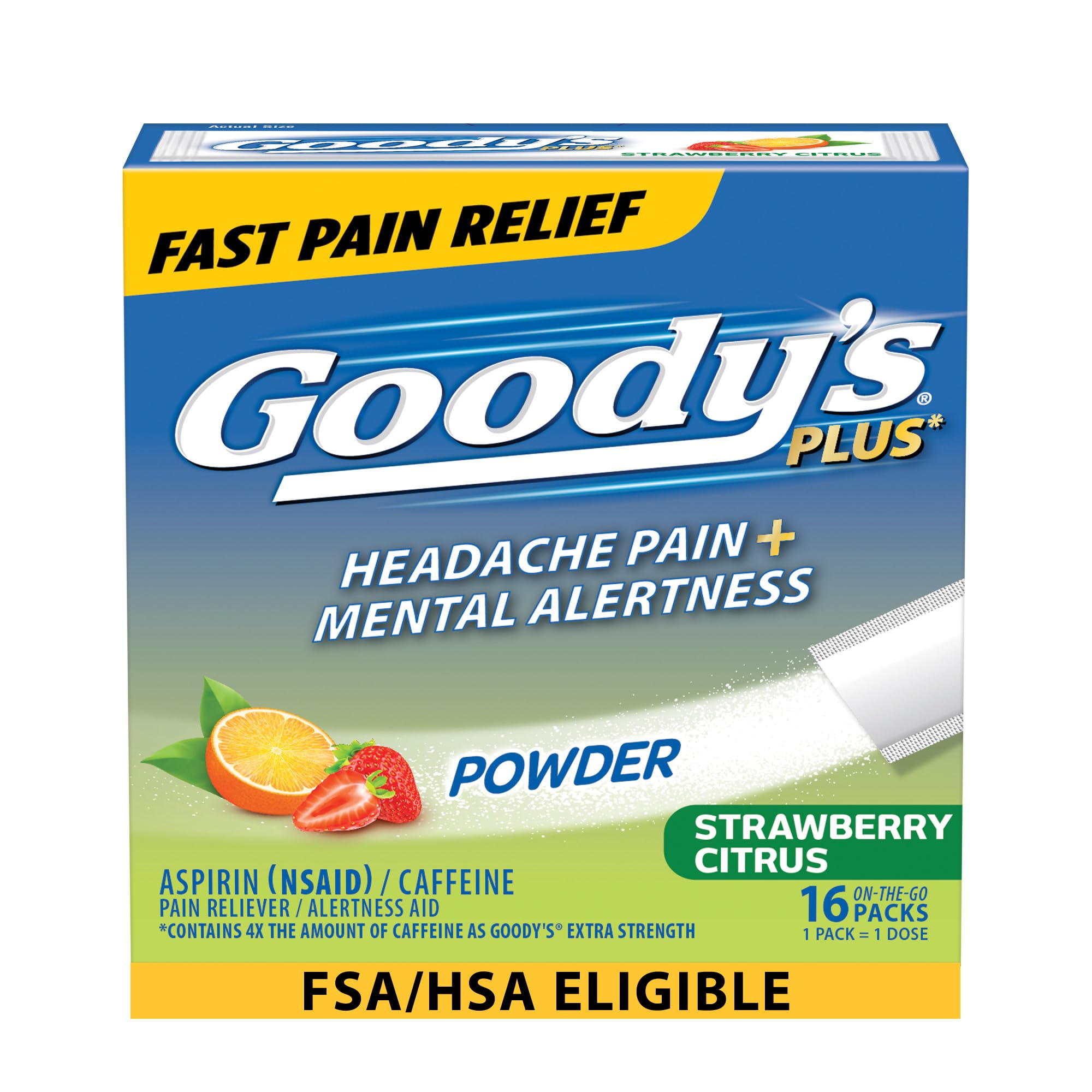 Goody's Headache Relief PLUS Mental Alertness Powder provides fast, powerful pain relief and a boost of mental alertness. Get relief from your strongest headaches, tension headaches, minor arthritis pain, colds, backaches, muscle aches, tooth pain, and menstrual cramps. Each aspirin and caffeine powder packet includes 1000 mg aspirin (NSAID) and 150 mg caffeine for rapid pain relief. Treat pain two ways: pour the easy to swallow Goody's powder directly on your tongue followed by a non-alcoholic beverage or mix into a non-alcoholic drink of choice. Great tasting Strawberry Citrus flavor. The over-the-counter medication powder comes in convenient, on-the-go aspirin and caffeine pouches for fast pain relief wherever you are, whenever you need it. Toss in travel medicine kits for strong, non-prescription pain relief. Contains 1 box of Goody's Headache Relief PLUS Mental Alertness Powder, 16 aspirin and caffeine pouches, for adults and children 12 years and older. Goody's Headache Relief Powder is FSA-eligible and HSA-eligible in the U.S. For fast pain relief, Get To Good.