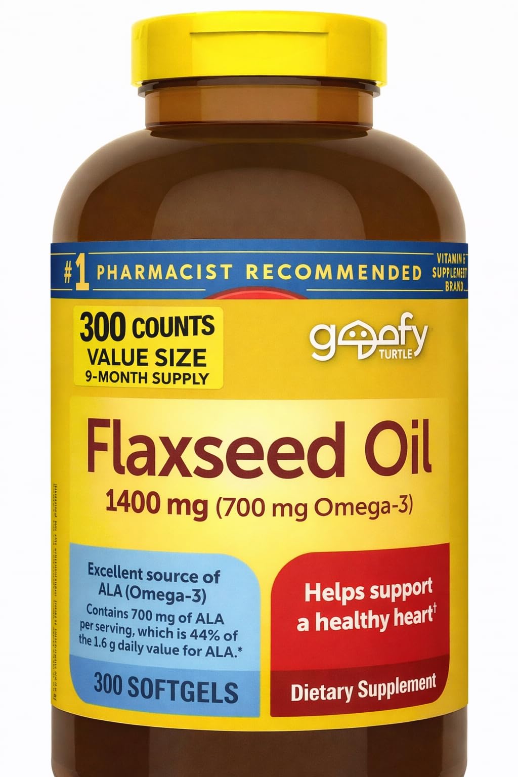 GOOFY TURTLE Nature Flaxseed Oil 1400mg (300 Softgels) | Plant-Based Omega-3 ALA Supplement | 9 Months of Supply.