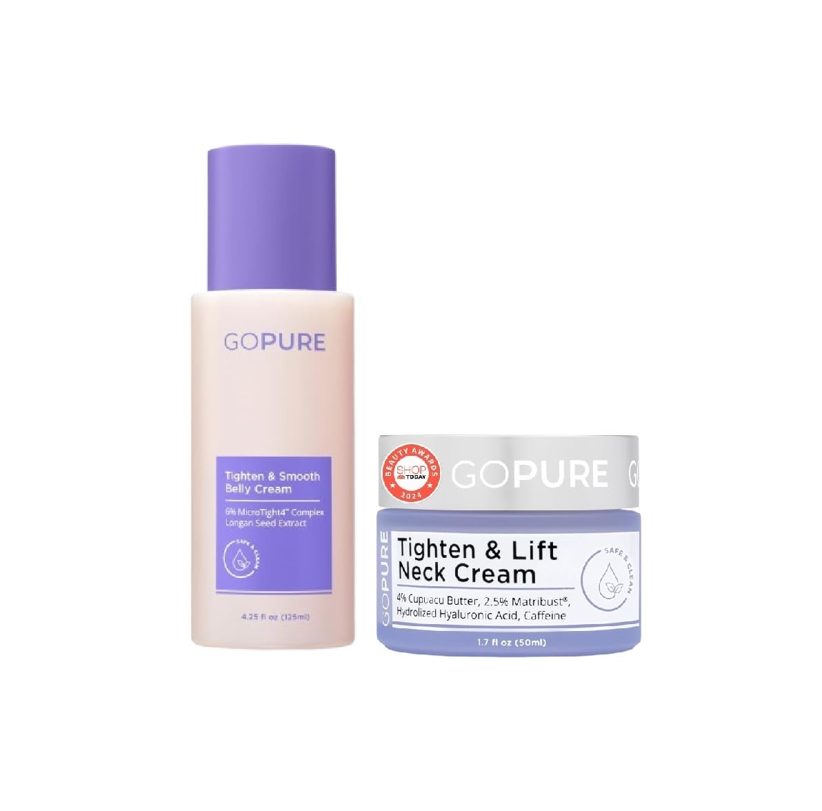 This Belly Cream is designed to visibly firm, lift, and smooth the skin on your belly, reducing the appearance of stretch marks and crepey skin. With key ingredients like Green Microalgae and Longan Seed, it supports collagen, improves elasticity, and enhances skin texture. The formula is enriched with omega-rich oils, including coconut and rosehip seed oil, for deep hydration and a supple, soft feel. Safe for all skin types, it cools on contact, dries fast, and leaves no greasy residue, offering visible results in just 4–8 weeks. Introducing goPure Beauty Neck Firming Cream, your ultimate solution for firmer, more youthful-looking skin. This advanced neck cream is specifically formulated to combat the visible signs of aging, providing you with the confidence and radiance you deserve. Embrace a youthful-looking complexion with our anti-aging neck cream that targets and tightens the look of sagging skin, restoring the appearance of firmness and elasticity to your neck area. Our anti-aging neck cream is designed to deliver transformative results. Infused with potent ingredients and clinically proven actives Redyless, Vexel-SP, and Matribust, it combats the effects of time and gravity, helping you achieve a tighter, smoother, and more toned-looking neck. Experience a visible lift and noticeable reduction in the signs of aging with this remarkable product. Formulated with Shea Butter and Sweet Almond Oil, goPure Neck Firming Cream provides deep hydration and nourishment for improved texture, reduced signs of aging, and fresh skin feel. Elevate your skincare routine with science-backed, clinically-proven skincare and experience the transformation firsthand as you embrace a more confident, youthful, and beautiful neck.GOPURE BEAUTY: Backed by science and cruelty-free practices, our clean and kind lineup was formulated to be safe and ultra effective. Enjoy a daily ritual that delivers natural botanicals, potent active ingredients, real results, and a luxury experience at prices that just make sense. ACHIEVE THE LOOK OF EVEN SKIN TONE: Experience the power of our neck tightening cream as it works to promote a more even skin tone, reducing the appearance of discoloration, "turkey neck" and visually lifting sagging skin. STRETCH MARK SUPPORT: Green Microalgae supports skin's natural collagen to improve the look of elasticity, while Longan Seed reduces the appearance of stretch marks and improves the look of skin texture. FIRM, LIFT, TIGHTEN: Our goPure Neck Firming Cream is specially formulated to target and combat sagging skin on the neck and chest, providing a visibly firmer and more lifted appearance giving the impression of wrinkle filler, even for deep wrinkles. TIGHTER LOOKING TUMMY: Thanks to a proprietary tightening complex, this multitasking cream visibly firms, lifts, and smooths the look of skin on the belly in just 4–8 weeks.