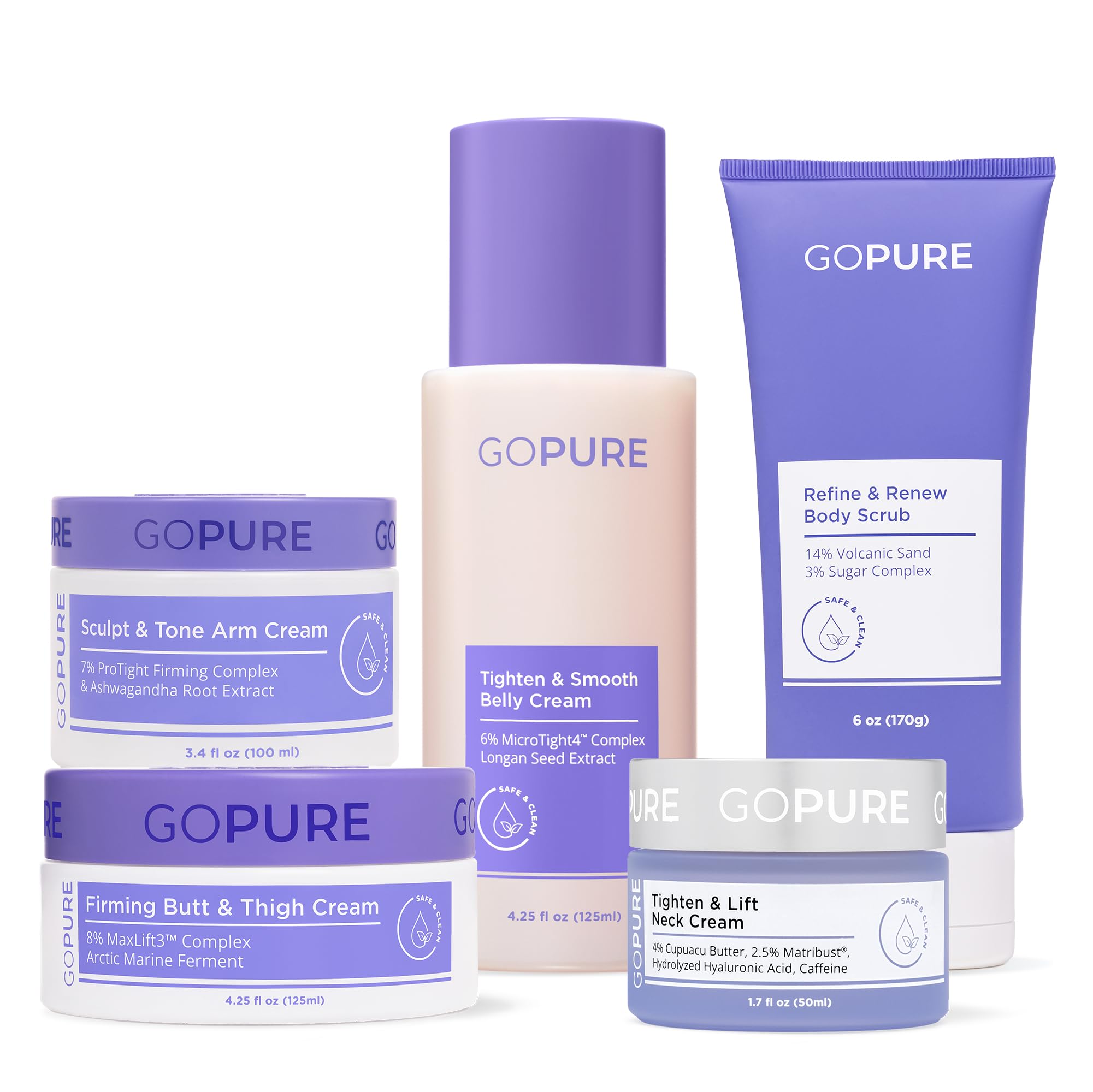 Transform your skincare routine with the ultimate body-firming collection designed to tighten, smooth, and sculpt from head to toe. This powerful bundle includes five targeted formulas that work in harmony to reveal visibly firmer, lifted, and more youthful-looking skin: Neck Firming Cream – Targets sagging skin on the neck and chest for a smoother, lifted look that softens even the appearance of deep wrinkles. Arm Firming Cream – A proprietary firming complex designed to tone, sculpt, and smooth the look of arms in just 4–8 weeks. Exfoliating Body Scrub – Prepares your skin by gently exfoliating, creating the perfect canvas for your firming creams to fully absorb and deliver results. Booty Cream – Creates a supportive invisible layer that visibly tightens and smooths loose, crepey skin on the butt and thighs. Tummy Tightening Cream – Firms, lifts, and smooths the look of belly skin for a tighter, more contoured appearance in 4–8 weeks. Together, these five powerhouse products deliver head-to-toe confidence, helping you achieve smoother, firmer, and more sculpted-looking skin wherever you need it most.TIGHTER LOOKING TUMMY: Thanks to a proprietary tightening complex, this multitasking cream visibly firms, lifts, and smooths the look of skin on the belly in just 4–8 weeks. BOOTY CREAM: This advanced formula creates an invisible supportive layer that tightens the look of loose, crepey skin on the butt and thighs, revealing a smoother, firmer appearance. BODY CARE BOOST: This scrub maximizes your results by revealing a clean slate for your targeted body products to fully sink in. FIRMER LOOKING ARMS: Thanks to a powerful, proprietary firming complex, this formula firms, smooths, and sculpts the look of skin on the arms in just 4-8 weeks. FIRM, LIFT, TIGHTEN: Our goPure Neck Firming Cream is specially formulated to target and combat sagging skin on the neck and chest, providing a visibly firmer and more lifted appearance giving the impression of wrinkle filler, even for deep wrinkles.