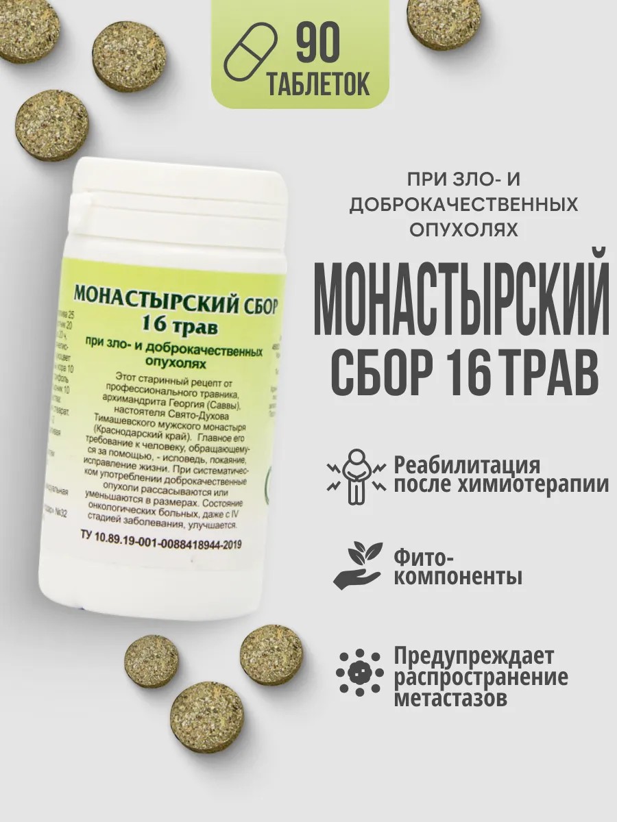 Монастырский сбор противоопухолевы в таблетках марки Здравница травника Гордеева. В составе Монастырского сбора - 16 целебных трав, обладающих противоопухолевым, противовоспалительным, антисептическим, иммуномодулирующим, антитоксическим, антиоксидантным действиями. Показания к применению противоопухолевого сбора: доброкачественные и злокачественные новообразования, вторичная профилактика рецидивов опухолевых процессов, ослабление организма, после хронических заболеваний. Травяной противоопухолевый сбор Гордеева рекомендован в качестве профилактического и общеукрепляющего средства, в том числе к противоопухолевой устойчивости организма. При систематическом употреблении монастырского сбора доброкачественные опухоли рассасываются или уменьшаются в размерах. Удобная форма в таблетках, позволяет комфортно принимать Монастырский сбор, а натуральный состав противоопухолевого сбора обеспечивает мягкое фармакологическое действие. В состав противоопухолевого сбора входит: крапива, тысячелистник, шалфей, ромашка, чабрец, пустырник, череда, шиповник, бессмертник, толокнянка, крушины кора, сухоцвета трава, чернобыльник, сушеница, березовые почки, трифоли листья. Курс приема монастырского противоопухолевого сбора 40 дней, затем перерыв 10-12 дней, курс повторить. Перед применение необходимо проконсультироваться с врачом!