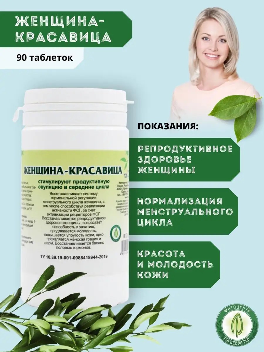 Женщина-красавица, 90 таблеток. Восстанавливают систему гормональной регуляции менструального цикла женщины, в том числе способствуя реализации активности ФСГ, за счет подавления синтеза а/т к рецепторам ФСГ. Восстанавливается репродуктивное здоровье женщины, возрастает способность к зачатию; продлевается молодость, повышается упругость кожи, ярко проявляется женская грация и шарм. Состав: боровой матки листья; душицы, клевера, чернобыльника трава; девясила, красной щетки корневища; вспомогательные вещества: лактоза, аэросил, кальция стеарат.