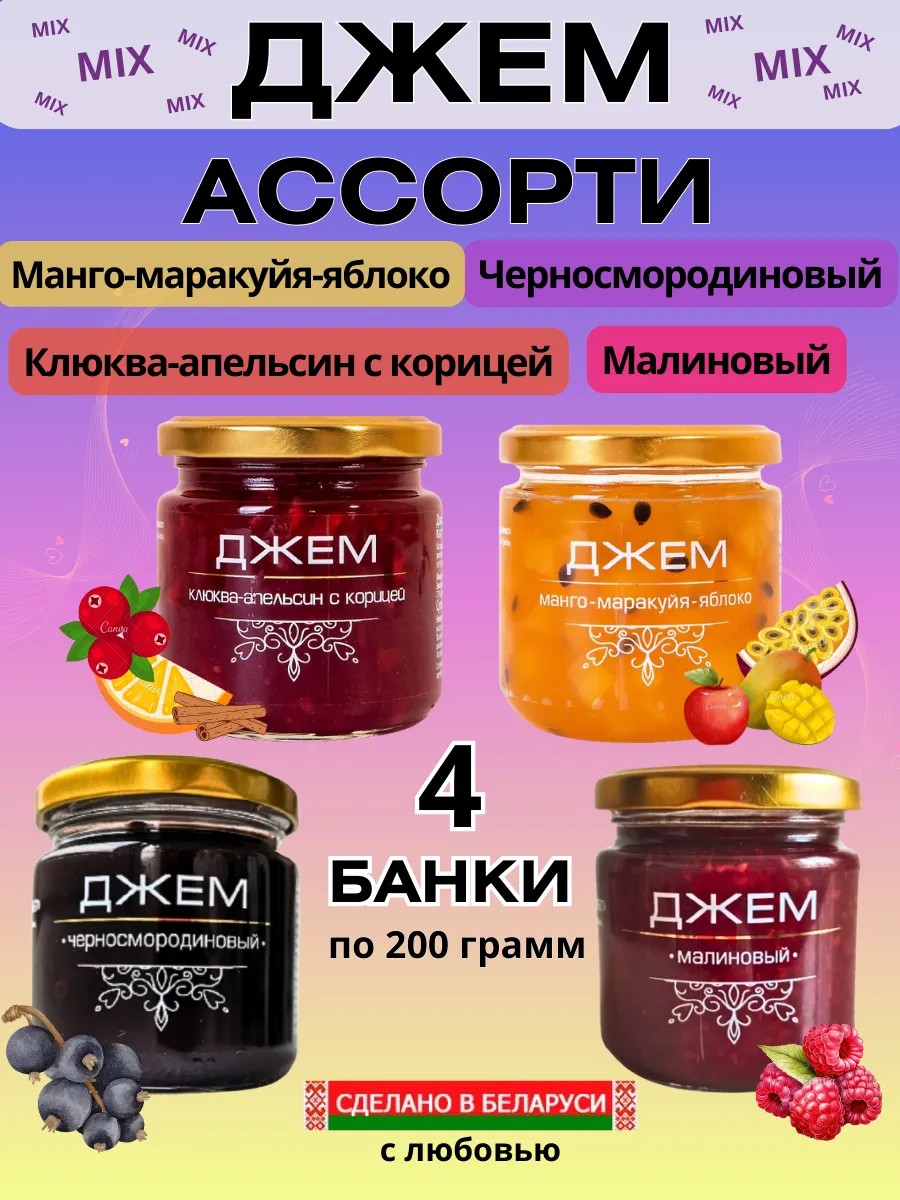 Moreover, the low-calorie properties of jams make them an ideal dessert or addition to your favorite dishes. Moreover, a set of assorted jams is perfect for children, as its composition provides beneficial elements and vitamins necessary for their health. By ordering a set of assorted jams, you will truly enjoy its variety of flavors and quality. Each jam variation has its own unique texture and harmonious combination of ingredients. Try raspberry jam and enjoy the vibrant flavor of ripe berries. Spice up your breakfast or dessert with a stunning mango-passionfruit-apple jam, which will add a special flavor to your dishes. And don't forget to try cranberry jam with orange and cinnamon - a unique combination of sweetness and aroma. Treat yourself or your loved ones to a true gastronomic delight by choosing a set of assorted jams. You won't regret your choice, because we guarantee you only the most delicious and healthy jam from Belarus. Enjoy the naturalness and taste of our jam - every sip will awaken pleasant emotions in you and give you a feeling of true bliss. The set of assorted jams is a real find for those who value not only quality but also taste!
