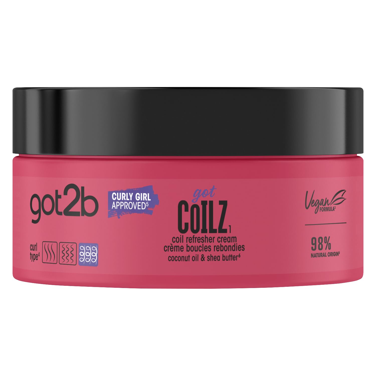 Schwarzkopf got2b gotcurlz Curl Refresher Cream is a 2 in 1 hair styling and care cream.It revitalises and moisturises curls and coils without weighing them down. It works by defining and sealing single coils to shape the hair. Curl and coil refresher cream, Curly girl method approve.It revitalises and defines curls- Infused with coconut oil, castor oil, argan oil and shea butter.Vegan formula with 98 percent naturally derived ingredients.Don't tame curls, embrace them, How to use, After washing, apply thoroughly to towel-dried hair. Do not rinse. Re-apply a small amount in dry hair if needed or to refresh coils the next day.Sustainability Promise, Our jar is made with 50 Percent recycled plastic (excluding labels and lid).The jar is designed for recycling check local recycling instructions. Including 75.7 Percent of water. INGREDIENTS Aqua, Cetearyl Alcohol, Glycerin, Caprylic/Capric Triglyceride, Butyrospermum Parkii Butter, Distearoylethyl Dimonium Chloride, Cocos Nucifera Oil, Betaine, Caesalpinia Spinosa Gum, Arachidyl Alcohol, Parfum, Panthenol, Sodium Benzoate, Behenyl Alcohol, Ricinus Communis Seed Oil, Argania Spinosa Kernel Oil, Arachidyl Glucoside, Citric Acid, Guar Hydroxypropyltrimonium Chloride, Benzyl Alcohol, Limonene, Coumarin, Aloe Barbadensis Leaf Juice Powder, Potassium Sorbate DIRECTIONS How to use: 1. After washing, apply thoroughly to towel-dried hair 2. Do not rinse 3. Re-apply a small amount to dry hair if needed or to refresh your curls and coils the next day Our coil refresher cream is more than just a leave-in! It can also be used as a nourishing day or overnight mask! MANUFACTURER CONTACT INFORMATION Henkel Ltd., Hemel Hempstead, Herts, HP2 4RQ. See moreVegan formula with 98 Percent naturally derived ingredients. Infused with coconut oil, castor oil, argan oil and shea butter. Revitalises and defines curls. Curly girl method approved. Curl and coil refresher cream.
