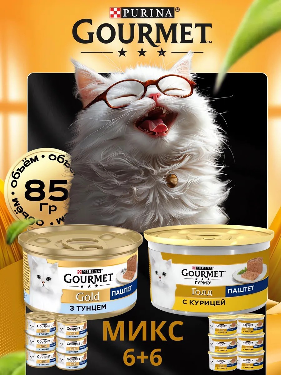 Корм Gourmet Gold(Гурмет голд)Пурина(Purina ) тунец и курица 85 г 6+6 микс для любой породы взрослые (1-6 лет) и старше паштет в банке Gourmet Gold - это золотая коллекция вкусов и текстур,такие как террин по - французски , паштет, нежные биточки и другие роскошные блюда, перед которыми не устоит даже самая взыскательная кошка. Каждый ингредиент блюда Gourmet Gold тщательно подобран и является превосходным вкусовым решением.Благодаря этому каждое блюдо получается настоящим шедевром.Паштет/Гурмет /тунец/85г/банка/вланжный корм