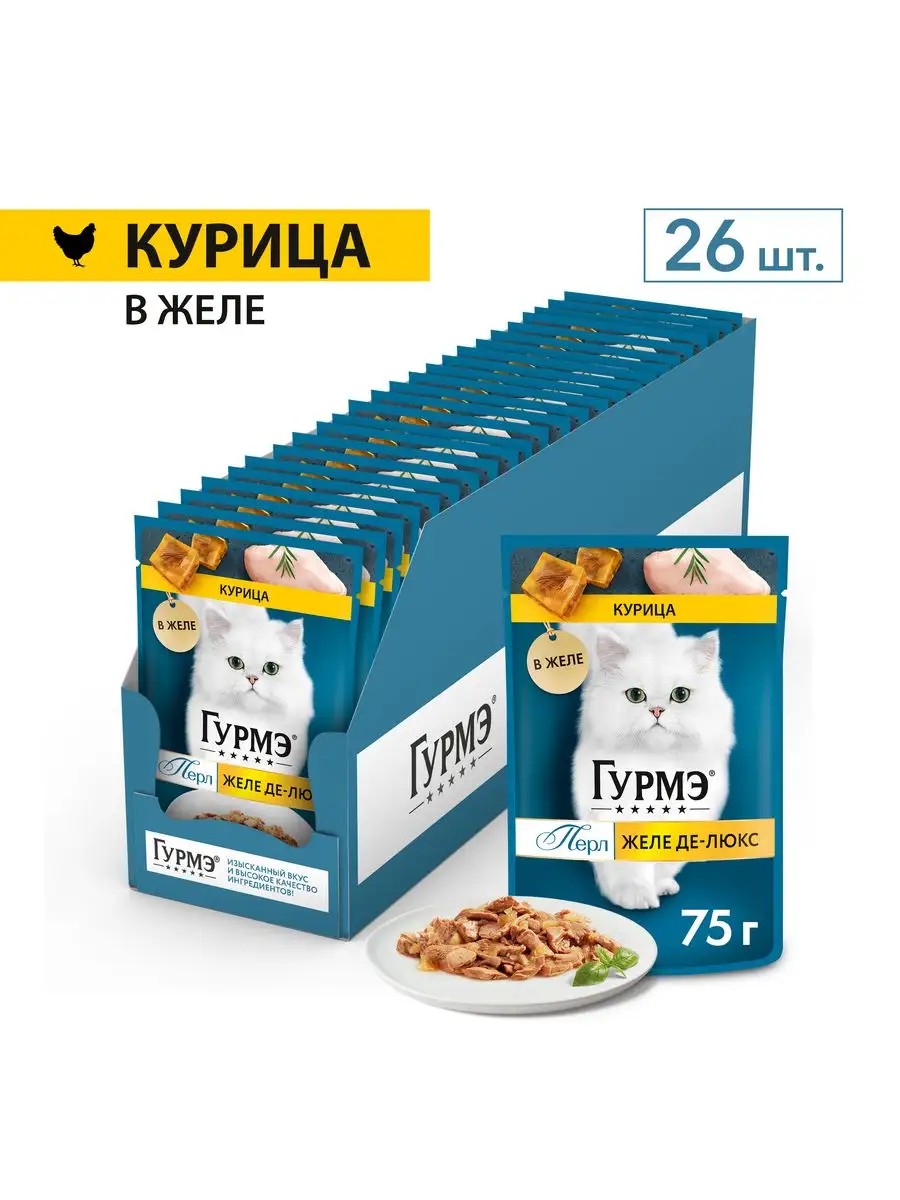 Гурмэ Перл Желе Де-Люкс влажный корм для кошек, с курицей в роскошном желе - 75 г х 26 шт. Корм для взрослых кошек "Перл Желе Де-Люкс" - это аккуратно нарезанное и бережно приготовленное филе с курицей, говядиной или лососем в роскошном желе. Корм для кошек от Гурмэ полнорационный, содержит все необходимые для здоровья микронутриенты. Влажный корм с богатой вкусовой палитрой не оставит равнодушным Вашего взыскательного гурмана. Комбинация белков и углеводов обеспечивает энергией. Клетчатка благотворно влияет на работу пищеварительной системы. Влажные корма Гурмэ не содержат искусственных ароматизаторов и консервантов. Ингредиенты: мясо и мясные ингредиенты (включая курицу), экстракты растительного белка, аминокислоты, рыба и продукты ее переработки, загустители, минеральные вещества, сахара, продукты переработки растительного сырья, витамины, ароматизатор курицы. Гарантированные показатели: влажность: 82,0%, белок: 11,5%, содержание жира: 2,5%, сырая зола: 2,0%, сырая клетчатка: 0,05%. Добавленные вещества: МЕ/кг: витамин А: 580; витамин Д3: 87; мг/кг: железо: 6,6; йод: 0,16; медь: 0,5; марганец: 1,2; цинк: 11; таурин: 360. Срок годности (дни): 720