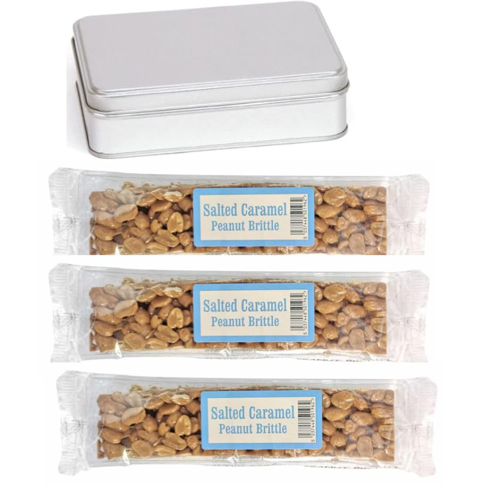 Ideal for Gifting or Personal Indulgence. Reusable Metal Tin. Sea Salt Infusion for Perfect Balance. Premium Roasted Peanuts. Three 100g Salted Caramel Peanut Brittle Bars.
