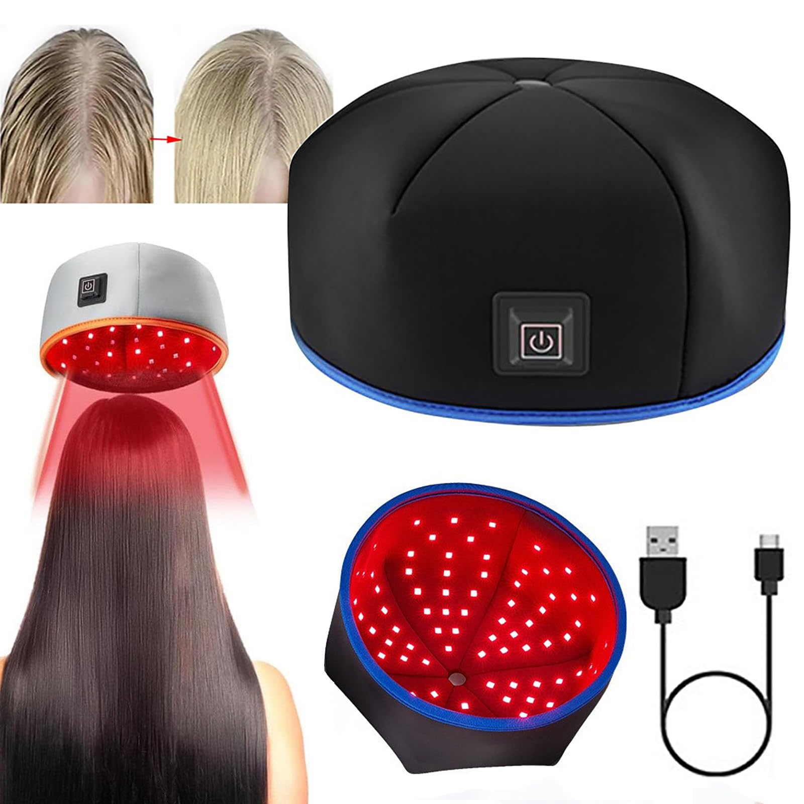 With 120 high-intensity LEDs, combined with 660nm red light and 850nm near-infrared light, 3 modes, one-button switching, each process is automatically timed for 20 minutes, and 5V voltage is supplied, you can use it with confidence. Specifications Product Name: Light Therapy Cap Temperature range: 43-45? Luminous duration: 20 minutes Lamp beads: 120 pieces Red light: 60 pieces of 660nm red light 60 pieces of 850nm infrared light Charging method: USB charging Size: 21.5 x 11cm Packing list 1 x Cap 1 x Data cable Note 1. For manual measurement, please allow a deviation of 1-30mm. 2. Due to the light and screen difference, the item's color may be slightly different from the pictures.SAFETY : The infrared light therapy cap is a safe and effective method of hair regrowth. The infrared light therapy cap works by emitting low levels of infrared light therapy, which can penetrate the scalp and stimulate hair follicles to thicken. WIDE APPLICABILITY : The infrared light therapy cap is lightweight, comfortable and easy to use. It is designed to be used in the privacy of your home, without going out for an appointment, suitable for all hair types, unisex. COMPLETE CARE : Not only promotes hair growth, but also improves scalp health, reduces dandruff, and makes hair healthier and shinier. TECHNOLOGICAL INNOVATION : Thanks to 120 high-intensity LEDs, the emitted red and near-infrared light can penetrate deep into the scalp and start the hair growth process. This cutting-edge technology combines science and comfort to bring you an unparalleled hair care experience. HAIR LOSS PREVENTION : It can help men and women prevent hair loss, dual wavelength technology, combining 660nm red light and 850nm near-infrared light, penetrates deep into the scalp to grow thicker and fuller hair. Avec 120 LED haute intensité, combinées à une lumière rouge de 660 nm et une lumière proche infrarouge de 850 nm, 3 modes, commutation à un bouton, chaque processus est automatiquement chronométré pendant 20 minutes et une tension de 5 V est alimentée, vous pouvez l'utiliser en toute confiance. Spécifications Nom du produit : bonnet de luminothérapie Plage de température : 43-45 ? Durée lumineuse : 20 minutes Perles de lampe : 120 pièces Lumière rouge : 60 pièces de lumière rouge 660 nm 60 pièces de lumière infrarouge 850 nm Méthode de charge : chargement USB Taille : 21,5 x 11 cm Liste de colisage 1 x bonnet 1 x câble de données Remarque 1. Pour une mesure manuelle, veuillez prévoir un écart de 1 à 30 mm. 2. En raison de la différence de lumière et d'écran, la couleur de l'article peut être légèrement différente de l'image.SÉCURITÉ : Le bonnet de luminothérapie infrarouge est une méthode sûre et efficace de repousse des cheveux. Le bonnet de luminothérapie infrarouge fonctionne en émettant de faibles niveaux de luminothérapie infrarouge, qui peuvent pénétrer le cuir chevelu et stimuler les follicules pileux pour s'épaissir. LARGE APPLICABILITÉ : Le bonnet de luminothérapie infrarouge est léger, confortable et facile à utiliser. Il est conçu pour être utilisé dans l'intimité de votre maison, sans sortir pour un rendez-vous, convient à tous les types de cheveux, unisexe. SOINS COMPLETS : Favorise non seulement la croissance des cheveux, mais améliore également la santé du cuir chevelu, réduit les pellicules et rend les cheveux plus sains et plus brillants. INNOVATION TECHNOLOGIQUE : Grâce à 120 LED haute intensité, la lumière rouge et proche infrarouge émise peut pénétrer profondément dans le cuir chevelu et démarrer le processus de croissance des cheveux. Cette technologie de pointe allie science et confort pour vous apporter une expérience de soins capillaires inégalée. PRÉVENTION DE LA PERTE DE CHEVEUX : Il peut aider les hommes et les femmes à prévenir la perte de cheveux, la technologie à double longueur d'onde, combinant la lumière rouge de 660 nm et la lumière proche infrarouge de 850 nm, pénètre profondément dans le cuir chevelu pour devenir des cheveux plus épais et plus volumineux.