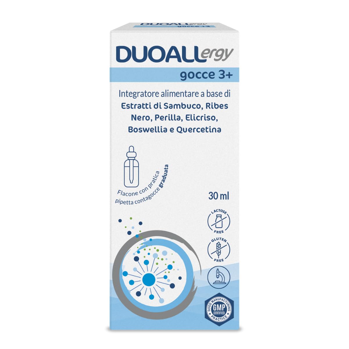 DUOALLERGY Drop 3 is a food supplement based on natural ingredients that supports the prevention and treatment of allergies in children. It may help to reduce the use of drugs such as antihistamines, cortisone, or decongestants. It is contraindicated and supported by preclinical scientific testing. Do not take the product if you have a known hypersensitivity to any of the ingredients. (in vitro assessment of the antiallergic and anti-inflammatory activity of a sample, DUOALLERGY mixture. TL PHARMA CONSULTING SRL - Protocol No. 230094726V_0 Milan - 24 01 2024.) Usage: Children aged 3-6 years: 0.5 ml to 1.5 ml per day. Children aged 6-12 years: 1 ml to 3 ml per day. Shake well before use and administer directly into the mouth with the accompanying pipette or using a teaspoon. Warning: Keep out of the reach and sight of children under 3 years of age to avoid accidental ingestion. Do not exceed the recommended daily dose without medical advice. Food supplements are not intended as a substitute for a varied and balanced diet and a healthy lifestyle. Do not use in case of hypersensitivity to one or more ingredients. Do not use if packaging is incomplete and or after the expiration date. The expiration date refers to the properly stored and unpacked product. Store at room temperature in a cool, dry place and protect from direct sunlight and heat. INGREDIENTS Water fructose stabilizer: glycerol E. Glycerol E. Glycerol elderberry (Sambucus nigra L. – flos et folium) E. Glicerico Ribes Black (Ribes nigrum L. – fructus) quercetin (from Sophora japonica L. Flos) E.S. Perilla Tit. 5 in polyphenols (Perilla frutescens (L.) Britton - Folium) Aroma E.S. Helichrysum italicum (red) G. Don. – Herba Cum Floribus) E.S. Boswellia Tit. 65 boswellic acids (Boswellia serrata Roxb. formerly Colebr. – rubber resin) preservative: potassium sorbate, sodium benzoate acidity regulator: lactic acid. SAFETY WARNING Do not use in case of hypersensitivity to one or more ingredients. Keep out of the reach of children under 3 years of age. Do not exceed the recommended daily dose. Food supplements are not intended as a substitute for a varied and balanced diet and a healthy lifestyle. Do not use in children under 3 years of age. MANUFACTURER CONTACT INFORMATION Mèdisin, Lissone, Italy See moreMade in Italy: All our nutritional supplements are produced in Italy. DUOALLERGY Drop 3 is gluten-free and lactose-free. It is contraindicated and supported by preclinical scientific testing. Do not take the product if you have a known hypersensitivity to any of the ingredients. (in vitro assessment of the antiallergic and anti-inflammatory activity of a sample, DUOALLERGY mixture. TL PHARMA CONSULTING SRL - Protocol No. 230094726V_0 Milan - 24 01 2024.). Application: It is recommended for children aged 3-6 years to take: 0.5 ml to 1.5 ml per day. Children 6-12 years: 1 ml to 3 ml per day. Shake well before use and administer directly into the mouth with the pipette or using a teaspoon. What contains: Sambuco promotes the fluidity of bronchial secretions and the function of the first respiratory tract. In addition, elderberry and perilla stimulate the body's natural defenses. Black ribs and EliCRISO promote the well-being of the nose and neck. Helichrysus also has a balsamic effect. DUOALLERGY Drop 3 is a dietary supplement based on natural ingredients that supports the prevention and treatment of allergies in children. Depending on the severity of symptoms, it may help to reduce the use of medications such as antihistamines, cortisone, or decongestants.Biodemia DUOALLERGY GOCCE 3 , vlierbes, zwarte bessen, perilla, helichrysum, boswellia, quercetine, ondersteunt de preventie en behandeling van allergieën, fles 30 ml DUOALLERGY Drop 3 is een voedingssupplement op basis van natuurlijke bestanddelen, dat de preventie en behandeling van allergieën bij kinderen ondersteunt. Het kan helpen het gebruik van geneesmiddelen zoals antihistaminica, cortisonica of decongestiva te verminderen. Het is gecontra-indiceerd en wordt ondersteund door preklinische wetenschappelijke tests. Neem het product niet in als u een bekende overgevoeligheid voor een van de bestanddelen heeft. (in vitro beoordeling van de anti-allergische en ontstekingsremmende werking van een monster, DUOALLERGY-mengsel. TL PHARMA CONSULTING SRL - Protocol nr. 230094726V_0 Milaan - 24 01 2024.) Gebruik: Kinderen van 3-6 jaar: 0,5 ml tot 1,5 ml per dag. Kinderen van 6-12 jaar: 1 ml tot 3 ml per dag. Voor gebruik goed schudden en met de bijbehorende schaalpipet direct in de mond of met behulp van een theelepel toedienen. Waarschuwing : Buiten het bereik en zicht van kinderen bewaren onder de 3 jaar om accidentele inname te voorkomen . Overschrijd de aanbevolen dagelijkse dosis niet zonder medisch advies. Voedingssupplementen zijn niet bedoeld als vervanging voor een gevarieerde en evenwichtige voeding en een gezonde levensstijl. Niet gebruiken bij overgevoeligheid voor een of meer ingrediënten. Niet gebruiken bij onvolledige verpakking en of na de houdbaarheidsdatum. De vervaldatum verwijst naar het correct opgeslagen en onverpakte product. Bewaren op kamertemperatuur op een koele, droge plaats en beschermen tegen direct zonlicht en hitte. INGREDIËNTEN Water fructose stabilisator: glycerol E. Glycerol E. Glycerol-vlierbes (Sambucus nigra L. – flos et folium) E. Glicerico Ribes Black (Ribes nigrum L. – fructus) quercetine (van Sophora japonica L. Flos) E.S. Perilla Tit. 5 in polyfenolen (Perilla frutescens (L.) Britton - Folium) Aroma E.S. Helichrysum italicum (rood) G. Don. – Herba Cum Floribus) E.S. Boswellia Tit. 65 boswelliazuren (Boswellia serrata Roxb. voorheen Colebr. – rubberhars) conserveermiddel: kaliumsorbaat, natriumbenzoaat zuurteregelaar: melkzuur. VEILIGHEIDSWAARSCHUWING Niet gebruiken bij overgevoeligheid voor een of meer ingrediënten. Buiten het bereik van kinderen jonger dan 3 jaar bewaren. De aanbevolen dagelijkse dosis niet overschrijden. Voed