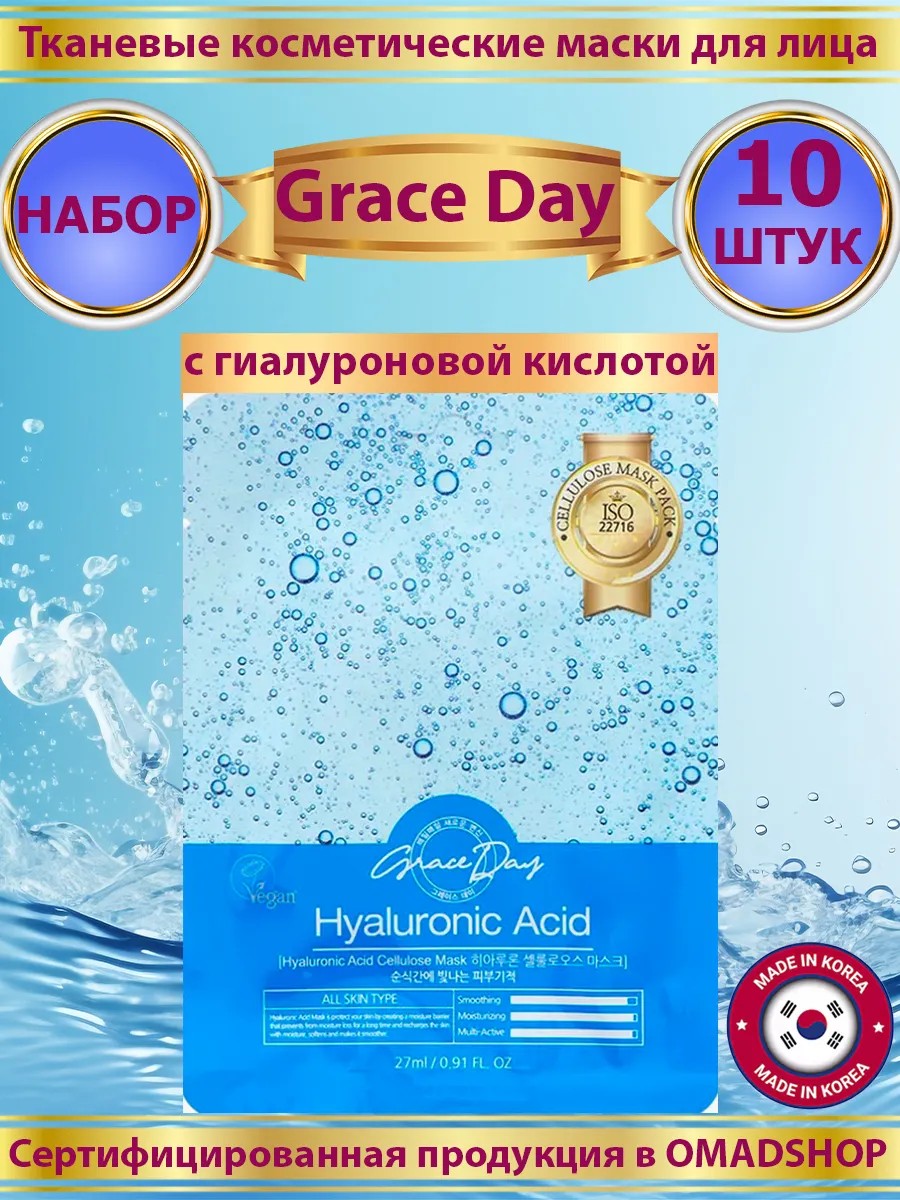 grace day Маски для лица тканевые с гиалуроновой кислотой 10шт