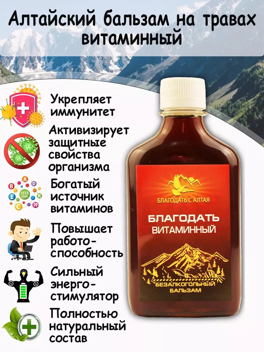 Погрузитесь в мир природной силы и энергии с алтайским бальзамом «Благодать! Наш фитобальзам обладает уникальным сочетанием природных витаминов, жизненно важных минералов и биоактивных веществ, которые обеспечивают иммуностимулирующее, антиоксидантное и противовирусное действие. Идеальный выбор для поддержания здоровья после перенесённых заболеваний и укрепления иммунитета.Наш бальзам способствует уничтожению патогенных микроорганизмов, стимулирует обмен веществ, помогает вывести из организма шлаки и токсины, а также повышает жизненный тонус и работоспособность. Благодаря противовоспалительным свойствам он помогает предотвратить простудные заболевания и общеукрепляющие свойства помогают справиться с недостатком витаминов.Безалкогольный бальзам «Благодать» активизирует защитные свойства организма, снижает ломкость капилляров, стимулирует кровообращение и очищает кровеносные сосуды. Энергетический бальзам также благоприятно влияет на нервную систему, снимает невротические состояния и обладает антидепрессивными свойствами. В составе сиропа для иммунитета натуральные травы Алтая: Шиповник – источник витаминов, общеукрепляющее средство, повышает защитные силы организма. Черемуха - стимулирует иммунную систему, понижает холестерин, регулирует содержание глюкозы в крови, мощный антиоксидант. Лист смородины - повышает защитные силы организма, повышает гемоглобин, источник витаминов. Облепиха - укрепляет иммунную систему, нормализует пищеварительную систему, метаболизм, выводит шлаки, улучшает память и укрепляет нервную систему. Лист земляники – снижает артериальное давление, помогает при гастритах, улучшает сон. Лист малины - повышает иммунитет и сопротивляемость инфекционным заболеваниям, регулирует сердечный ритм, повышает физическую выносливость, препятствует процессам старения. Маралий корень (левзея) - тонизирует организм, стимулирует активность, поддерживает иммунитет, омолаживающий эффект, очищает кровь от токсинов. Бадан - укрепляет стенки сосудов, оказывает тонизирующее действие, улучшает мужскую потенцию, повышает иммунную защиту организма.Алтайский бальзам «Благодать» - настоящая алтайская сказка, которая придаст вам живительную энергию и укрепит ваше здоровье. Попробуйте наш медовый бальзам и почувствуйте силу горного Алтая! Способ применения: употреблять по 1-2 столовой ложке (15 мл) с чаем, соками, минеральной водой, молоком и другими напитками 3 раза в день во время еды. Продолжительность приема 1 месяц. Перед употреблением взбалтывать. Противопоказания: индивидуальная непереносимость компонентов. Условия хранения: хранить при температуре не выше 25 градусов и относительной влажности воздуха не более 75%. Срок годности 2 года. Бальзам "Благодать" источник витаминов - собрал в себе все самое лучшее от природы (целебные плоды и травы) и бережно заботится о Вашем иммунитете. Погрузитесь в атмосферу магии и алтайской сказки с нашими бальзамами. Выберите тот, который нужен именно вам или вашим близким и ощутите всю мощь Горного Алтая. Насладитесь всеми преимуществами природы и позаботьтесь о своем здоровье прямо сейчас!