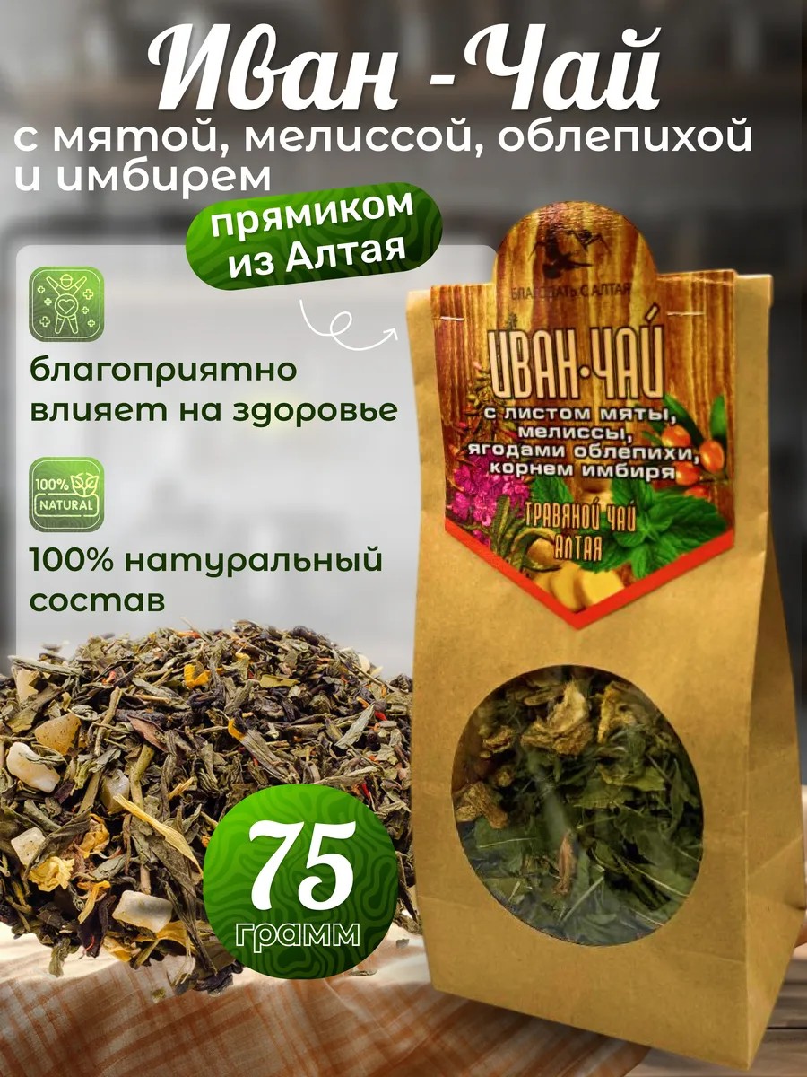 | Комплектация | Иван-чай с мятой, мелиссой, облепихой и имбирем 75 грамм |