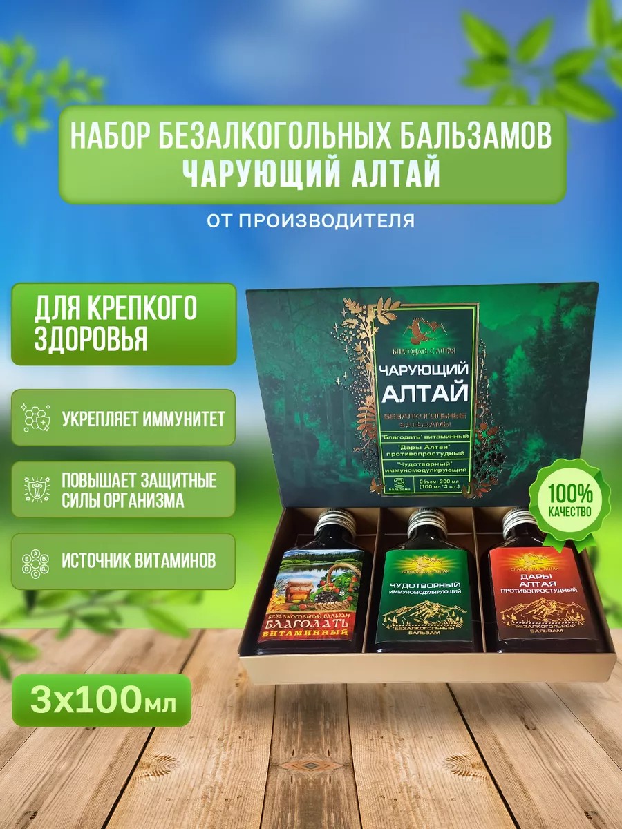 КомплектацияБезалкогольный бальзам «Дары Алтая»; безалкогольный бальзам «Благодать» витаминный; безалкогольный бальзам «Чудотворный» иммуномодулирующий; 3 шт. по 100 мл.