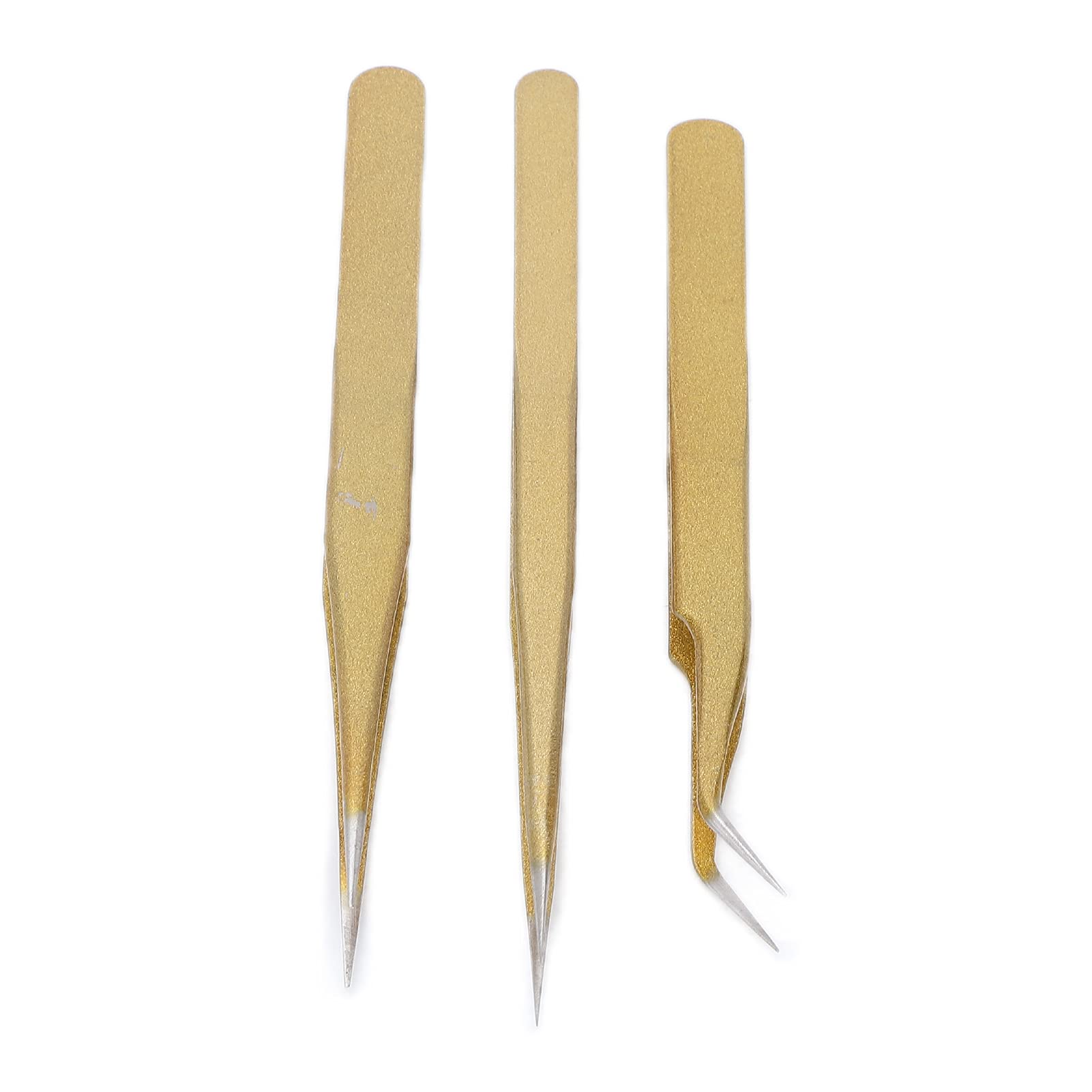 Feature: 1. High sharpness, strong biting strength, tightly clamping, which is easy to use. 2. Gold plated surface, exquisite and fashionable, comfortable to grip, antiskid, you will not feel tired after long time use. 3. Ergonomic design, the hardness of the tip is strengthened, not deformed under the strong pressure, and not burst. 4. Edge arc chamfering design, which is carefully polished to prevent bump against. 5. Widely Application, which can be used for eyelashes beautify, manicure, DIY, etc. Specification: Item Type: Tweezers Set Material: Stainless Steel #1 Straight Tip Tweezer Size: Approx.13.4 x 1cm / 5.3 x 0.4in #2 Straight Tip Tweezer Size: Approx.14.2 x 0.8cm / 5.6 x 0.3in #3 Curved Tip Tweezer Size: Approx.12.2 x 1cm / 4.8 x 0.4in Uses: Graft eyelashes, manicure, DIY, repairing Characteristics: Hard and inflexible, close tightly, ergonomic energy saving, even elasticity, acid proofing, antimagnetic, corrosion resistance. Package List: 1 x #1 Straight Tip Tweezer1 x #2 Straight Tip Tweezer 1 x #3 Curved Tip Tweezer INGREDIENTS defaultWidely Application, which can be used for eyelashes beautify, manicure, DIY, etc. Edge arc chamfering design, which is carefully polished to prevent bump against. Ergonomic design, the hardness of the tip is strengthened, not deformed under the strong pressure, and not burst. Gold plated surface, exquisite and fashionable, comfortable to grip, antiskid, you will not feel tired after long time use. High sharpness, strong biting strength, tightly clamping, which is easy to use.