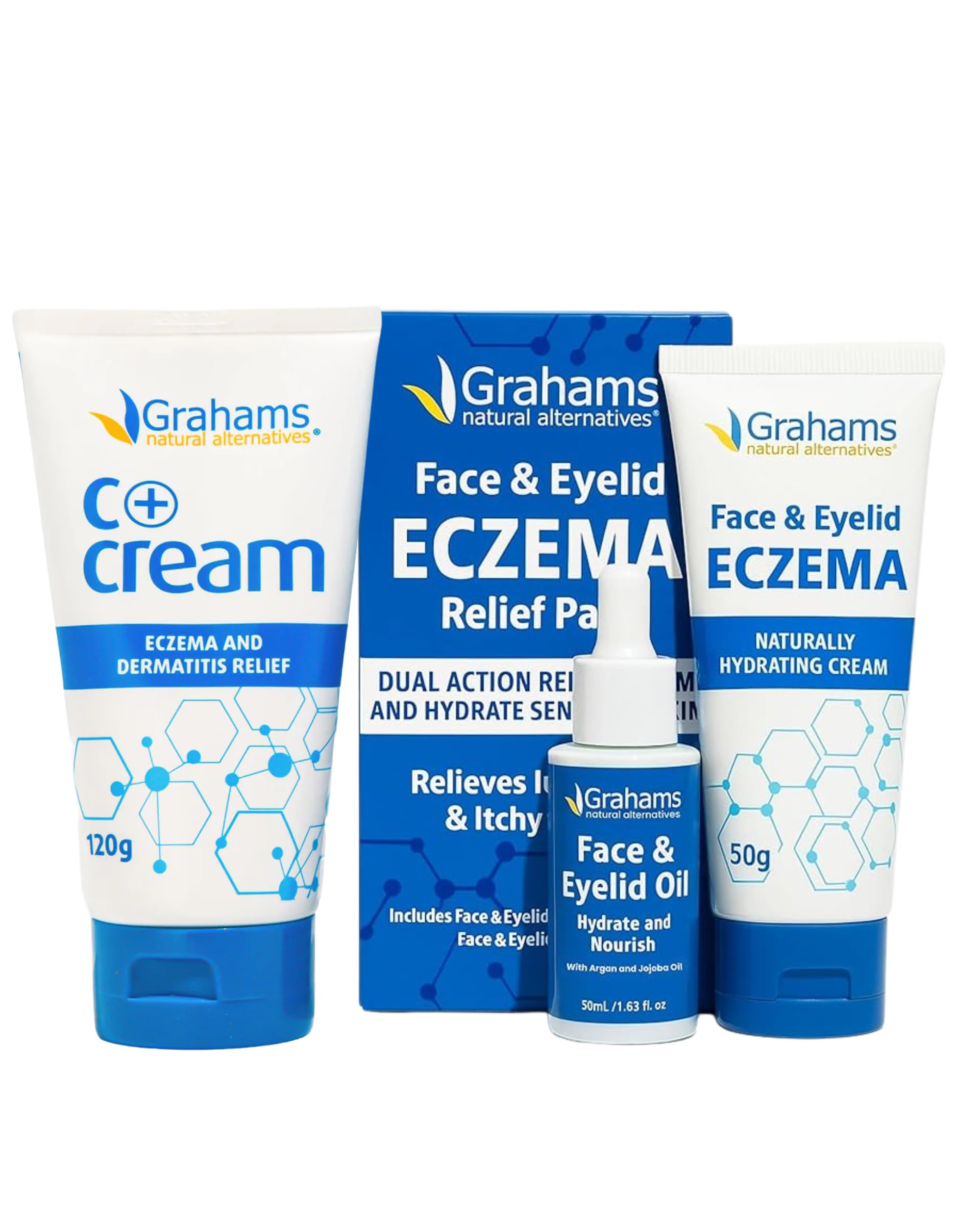 Experience comprehensive relief from symptoms of eczema from head to toe with the Grahams Natural Eczema Bundle, combining our C Eczema Cream with the Face Eyelid Eczema Relief Pack. This complete, steroid-free skincare system is specially formulated to target dryness, redness, and irritation - whether it appears on the body, face, or delicate eyelid area. Backed by over 20 years of research, it offers a gentle, effective solution for symptoms of eczema and dermatitis. The Face Eyelid Relief Pack features two products: a lightweight, nutrient-rich Face Eyelid Oil and a soothing Eczema Cream with Colloidal Oatmeal (2 ) designed for delicate facial areas. The 100 oil is packed with jojoba, apricot kernel, and argan oils, restores skin barrier function and preps the skin to absorb the healing benefits of the cream. Together, they hydrate deeply, relieve itching, and calms redness around the eyes, nose, and mouth - making it ideal for dry skin caused by eczema, seborrheic dermatitis, and perioral dermatitis. Complementing this is the C Eczema Cream, enriched with Manuka honey, Calendula, and Gotu Kola to soothe and protect skin on the hands, arms, legs, or scalp. This effective emollient cream locks in moisture for up to 6 hours, helping to rebuild the skin barrier and relieve stubborn eczema symptoms - all without harsh chemicals or corticosteroids. Gentle enough for all ages and skin types, this bundle delivers targeted relief and whole-body restoration, naturally.Clinically Proven Results: Backed by 20 years of research and developed by a family that understands eczema first-hand, this bundle is safe for the whole family and proven to reduce eczema symptoms and provide long lasting skin hydration. Natural Steroid-Free: Our formulas are steroid-free, hypoallergenic, and made with natural ingredients like Manuka Honey, Calendula, Colloidal Oatmeal and Gotu Kola to soothe, repair, and protect, without harsh chemicals, fragrances, or parabens. Perfect for those going through TSW!. Dry Skin Itch Relief: Both C and Face Eyelid Creams provide itch relief, while the Face Eyelid Oil helps to lock in moisture and deliver long-lasting nourishment. Especially effective before bedtime to help repair and restore the skin overnight. Whole Body Eczema Relief: Apply the C Eczema Cream to areas like arms, legs, knees, hands, wrists and elbows, and the Face Eyelid Eczema Cream to the more sensitive facial region. Use 2–3 times daily to reduce occurance of flare-ups, calm irritation, and provide a protective skin barrier. Complete Eczema Skincare Kit: Whether you're battling eczema on your hands, knees, scalp, or delicate facial areas, this powerful 3-step bundle combines our popular C Eczema Cream with our Face Eyelid Eczema Relief Kit.