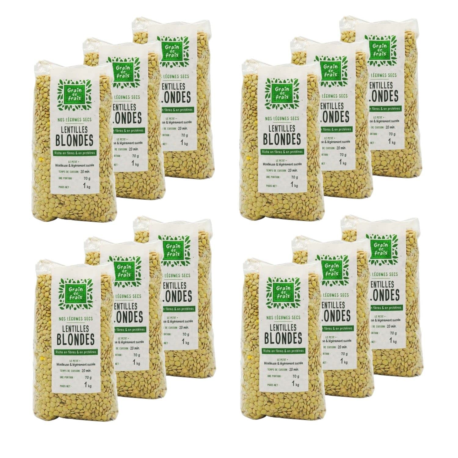This pack contains 12 products described below: Blonde lentils, grown in North America, will enhance your stews with meat (sausages, ham hocks) or poultry, your terrines, or in salads. They pair perfectly with bacon, duck, or salmon. A 70g serving provides twice as much vitamin B9 as a 200g serving of cooked zucchini. Lentils have excellent nutritional properties and are well worth discovering. Ingredients: Blonde lentils. Allergens: None Storage instructions: Store at room temperature, away from heat and humidity, before opening. Serving suggestion: 70g per person. Cooking instructions: Approximately 20 minutes in 1.5 liters of boiling water, salted halfway through. Product information: Net weight: 1kg Origin: Canada Energy: 1225kJ 292kcal Fat: 1.1g, of which saturates 0.5g Carbohydrate: 30g, of which sugars 2g Protein: 26g Dietary fiber: 30g Salt: 0.02g Packaging: Plastic bag Full details are available on the product packaging. The information on this page is for guidance only. We encourage you to read the information on the product label, especially regarding food allergies. SAFETY WARNING Full details are available on the product packaging. The information on this page is for guidance only. We encourage you to read the information on the product label, especially regarding food allergies.Lot 12x Lentille blonde - Sachet 1kgDESCRIPTION DU PRODUIT DESCRIPTION DU PRODUIT Ce lot contient 12 produits décrits ci-dessous : Les lentilles blondes, cultivées en Amérique du Nord, raviront vos plats mijotés à base de viandes (saucisses, jarrets) ou volaille, pour vos terrines ou en salade. L'association avec des lardons, du canard ou du saumon est à faire sans hésitation. Une portion de 70g apporte 2 fois plus de vitamine B9 qu'une portion de 200g de courgettes cuites. Les lentilles ont d'excellentes propriétés nutritionnelles, elles sont à découvrir. "Ingrédients : Lentilles blondes. Allergènes : Aucun Mode de conservation : A conserver à température ambiante, à l'abri de la chaleur et de l'humidité avant ouverture. Conseil d'utilisation : 70g par personne. Cuisson : environ 20 minutes dans 1.5 litre d'eau bouillante et salée en mi-cuisson. Informations produit : Poids net : 1kg Origine : Canada Energie : 1225KJ 292Kcal Lipides : 1,1g dont acides gras saturés 0,5g Glucides : 30g dont sucres 2g Protéines : 26g Fibres alimentaires : 30g Sel : 0,02g Emballage : Sachet en Plastique Détail complet et disponible sur l'emballage du produit. Les informations présentes sur cette page sont à titre indicatif. Nous vous invitons à prendre connaissance des informations sur l'étiquette du produit, en particulier concernant les allergies alimentaires. AVERTISSEMENT DE SÉCURITÉ Détail complet et disponible sur l'emballage du produit. Les informations présentes sur cette page sont à titre indicatif. Nous vous invitons à prendre connaissance des informations sur l'étiquette du produit, en particulier concernant les allergies alimentaires.
