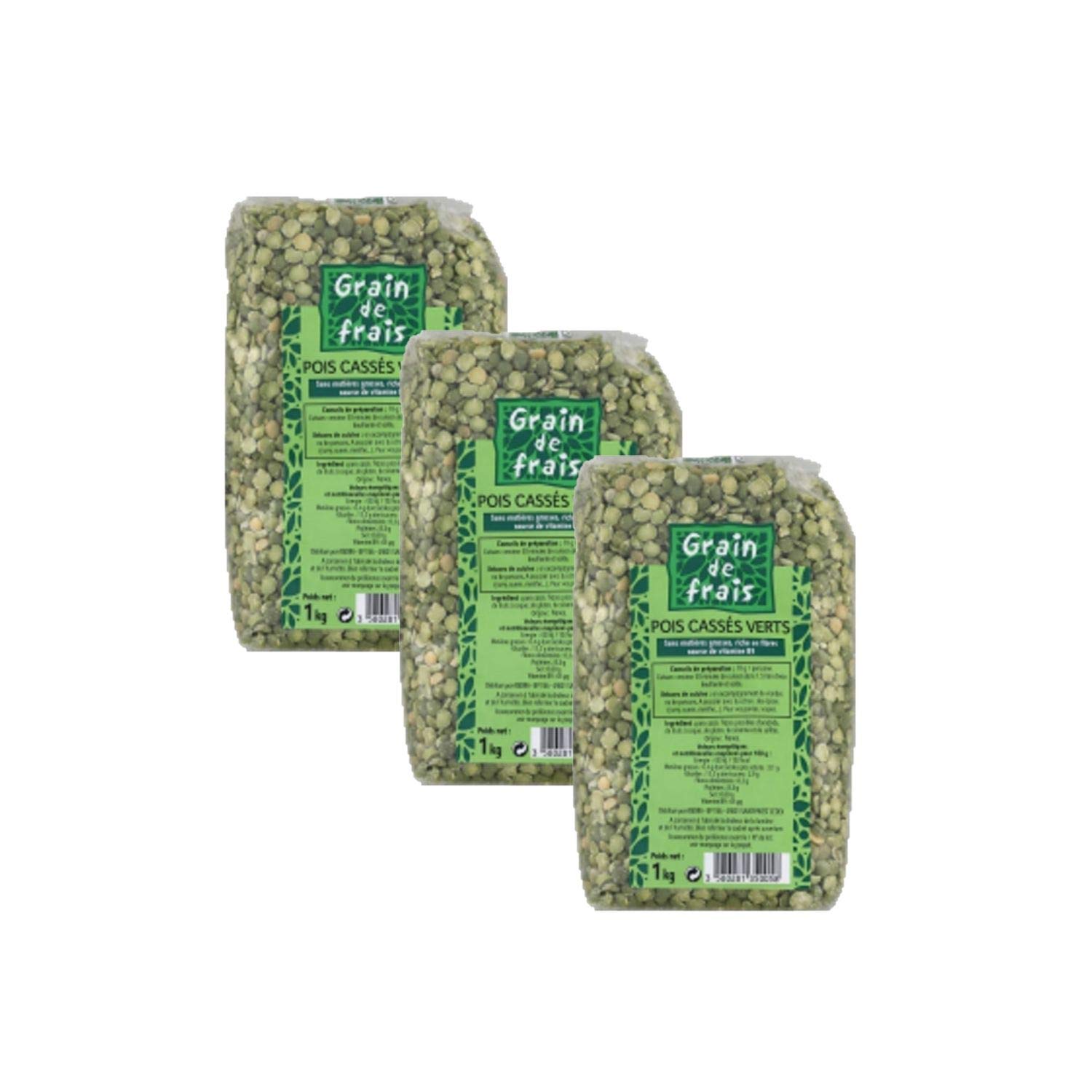 This pack contains 3 products described below: Split peas are simply dried peas that have had their skins removed and have been split in half. They are very interesting legumes from a nutritional point of view. These French split peas can be cooked in salads, soups, or even purées. Discover many easy and quick recipes, classic, spicy. Split peas are among the starchy foods that cook very slowly. It is necessary to soak them for 1 hour in cold water before cooking. The simplest way to prepare them is then to put them in a large saucepan, cover them with 4 to 5 times their volume of cold water, and then let them cook for 30 to 40 minutes. Split peas have the advantage of being more digestible than other legumes, such as chickpeas, because they contain little fiber. Ingredients: Split peas. Allergens: May contain traces of peanuts, tree nuts, gluten, sesame, and sulfites. Storage instructions: Store at room temperature, away from heat and humidity, before and after opening. Serving instructions: Serves 70g per person. Cooking instructions: Approximately 30 to 40 minutes in 1.5 liters of boiling, salted water. Product information: - Net weight: 1kg - Origin: France Nutritional values per 100g: - Energy: 1257kJ 299kcal - Fat: 1.2g, of which saturates 0.5g - Carbohydrate: 35g, of which sugars 8g - Protein: 24g - Fiber: 25g - Salt: 0.04g Packaging: Plastic bag. The information on this page is provided for guidance only. Only the information on our product packaging is legally binding. We encourage you to consult it before consumption, especially regarding food allergies. SAFETY WARNING Full details are available on the product packaging. The information on this page is for guidance only. We encourage you to read the information on the product label, particularly regarding food allergies.Lot 3x Pois cassé - Grain de Frais - paquet 1kgDESCRIPTION DU PRODUIT DESCRIPTION DU PRODUIT Ce lot contient 3 produits décrits ci-dessous : Le pois cassé est tout simplement un pois sec dont la peau a été retirée et qui a été fendu en deux. Ce sont des légumineuses très intéressantes d'un point de vu nutrionnelle. Ces pois cassés français peuvent être cuisinés en salade, en soupe ou encore en purée. Découvrez de nombreuses recettes faciles et rapides, classiques, épicés. Les pois cassés font partie des féculents dont la cuisson est très lente. Il est nécessaire de les faire tremper 1 heure dans de l'eau froide avant de les faire cuire. La manière la plus simple ensuite de les préparer est de les mettre dans une grande casserole, de les couvrir de 4 à 5 fois leur volume d'eau froide, puis de laisser cuire 30 à 40 min. Les pois cassés ont l'avantage d'être plus digestes que d'autres légumineuses, comme le pois chiche par exemple, car ils contiennent peu de cellulose. Ingrédients : Pois cassé. Allergènes : Traces possible d'arachide, de fruits à coque, de gluten, de sésame et de sulfites. Mode de conservation : A conserver à température ambiante, à l'abri de la chaleur et de l'humidité avant et après ouverture. Conseil d'utilisation : Portion de 70g par personne. Cuisson : environ 30 à 40 minutes dans 1.5 litre d'eau bouillante et salée. Informations produit : - Poids net : 1kg - Origine : France Valeurs nutritionnelles pour 100g : - Energie : 1257kJ 299Kcal - Lipides : 1,2g dont acides gras saturés 0,5g - Glucides : 35g dont sucres 8g - Protéines : 24g - Fibres alimentaires : 25g - Sel : 0,04g Emballage : Sachet plastique. Les informations contenues sur cette page sont transmises à titre indicatif. Seules les indications qui figurent sur l'emballage de nos produits font foi. Nous vous invitons à vous y référer avant consommation, notamment en AVERTISSEMENT DE SÉCURITÉ Détail complet et disponible sur l'emballage du produit. Les informations présentes sur cette page sont à titre indicatif. Nous vous invitons à prendre connaissance des informations sur l'étiquette du produit, en particulier concernant les allergies alimentaires.