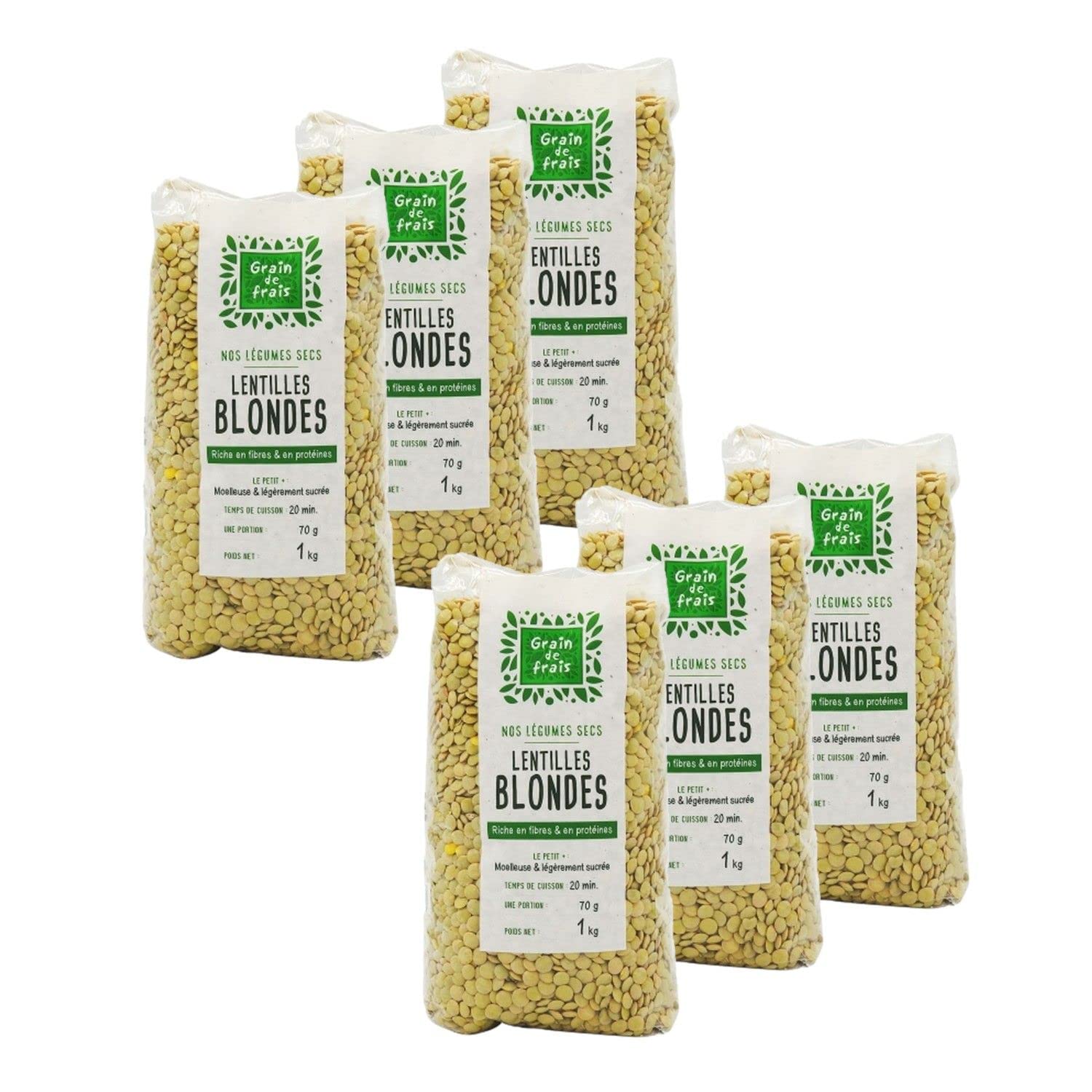 This pack contains 6 products described below: Blonde lentils, grown in North America, will enhance your stews with meat (sausages, shanks) or poultry, your terrines, or in salads. They pair perfectly with bacon, duck, or salmon. A 70g serving provides twice as much vitamin B9 as a 200g serving of cooked zucchini. Lentils have excellent nutritional properties and are well worth discovering. Ingredients: Blonde lentils. Allergens: None Storage instructions: Store at room temperature, away from heat and humidity, before opening. Serving suggestion: 70g per person. Cooking instructions: Approximately 20 minutes in 1.5 liters of boiling water, salted halfway through. Product information: Net weight: 1kg Origin: Canada Energy: 1225kJ 292kcal Fat: 1.1g, of which saturates 0.5g Carbohydrate: 30g, of which sugars 2g Protein: 26g Dietary fiber: 30g Salt: 0.02g Packaging: Plastic bag Full details are available on the product packaging. The information on this page is for guidance only. We encourage you to read the information on the product label, especially regarding food allergies. SAFETY WARNING Full details are available on the product packaging. The information on this page is for guidance only. We encourage you to read the information on the product label, especially regarding food allergies.Lot 6x Lentille blonde - Sachet 1kgDESCRIPTION DU PRODUIT DESCRIPTION DU PRODUIT Ce lot contient 6 produits décrits ci-dessous : Les lentilles blondes, cultivées en Amérique du Nord, raviront vos plats mijotés à base de viandes (saucisses, jarrets) ou volaille, pour vos terrines ou en salade. L'association avec des lardons, du canard ou du saumon est à faire sans hésitation. Une portion de 70g apporte 2 fois plus de vitamine B9 qu'une portion de 200g de courgettes cuites. Les lentilles ont d'excellentes propriétés nutritionnelles, elles sont à découvrir. "Ingrédients : Lentilles blondes. Allergènes : Aucun Mode de conservation : A conserver à température ambiante, à l'abri de la chaleur et de l'humidité avant ouverture. Conseil d'utilisation : 70g par personne. Cuisson : environ 20 minutes dans 1.5 litre d'eau bouillante et salée en mi-cuisson. Informations produit : Poids net : 1kg Origine : Canada Energie : 1225KJ 292Kcal Lipides : 1,1g dont acides gras saturés 0,5g Glucides : 30g dont sucres 2g Protéines : 26g Fibres alimentaires : 30g Sel : 0,02g Emballage : Sachet en Plastique Détail complet et disponible sur l'emballage du produit. Les informations présentes sur cette page sont à titre indicatif. Nous vous invitons à prendre connaissance des informations sur l'étiquette du produit, en particulier concernant les allergies alimentaires. AVERTISSEMENT DE SÉCURITÉ Détail complet et disponible sur l'emballage du produit. Les informations présentes sur cette page sont à titre indicatif. Nous vous invitons à prendre connaissance des informations sur l'étiquette du produit, en particulier concernant les allergies alimentaires.