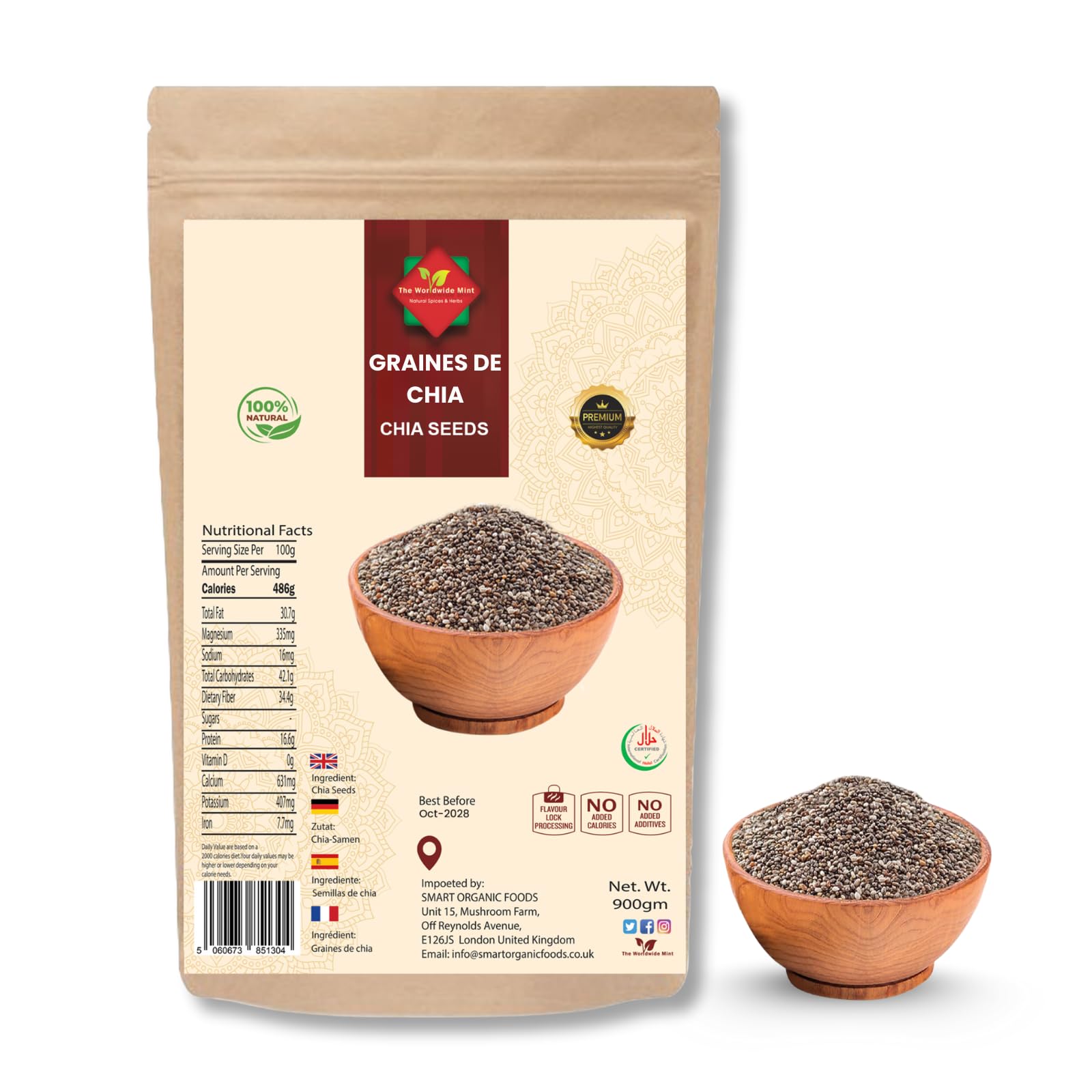 Graines de chia (900 g) Graines de chia crues Pures et naturelles Végétalien Sans gluten Sans OGM Qualité supérieure Source de fibres Sans additifs Authentiques