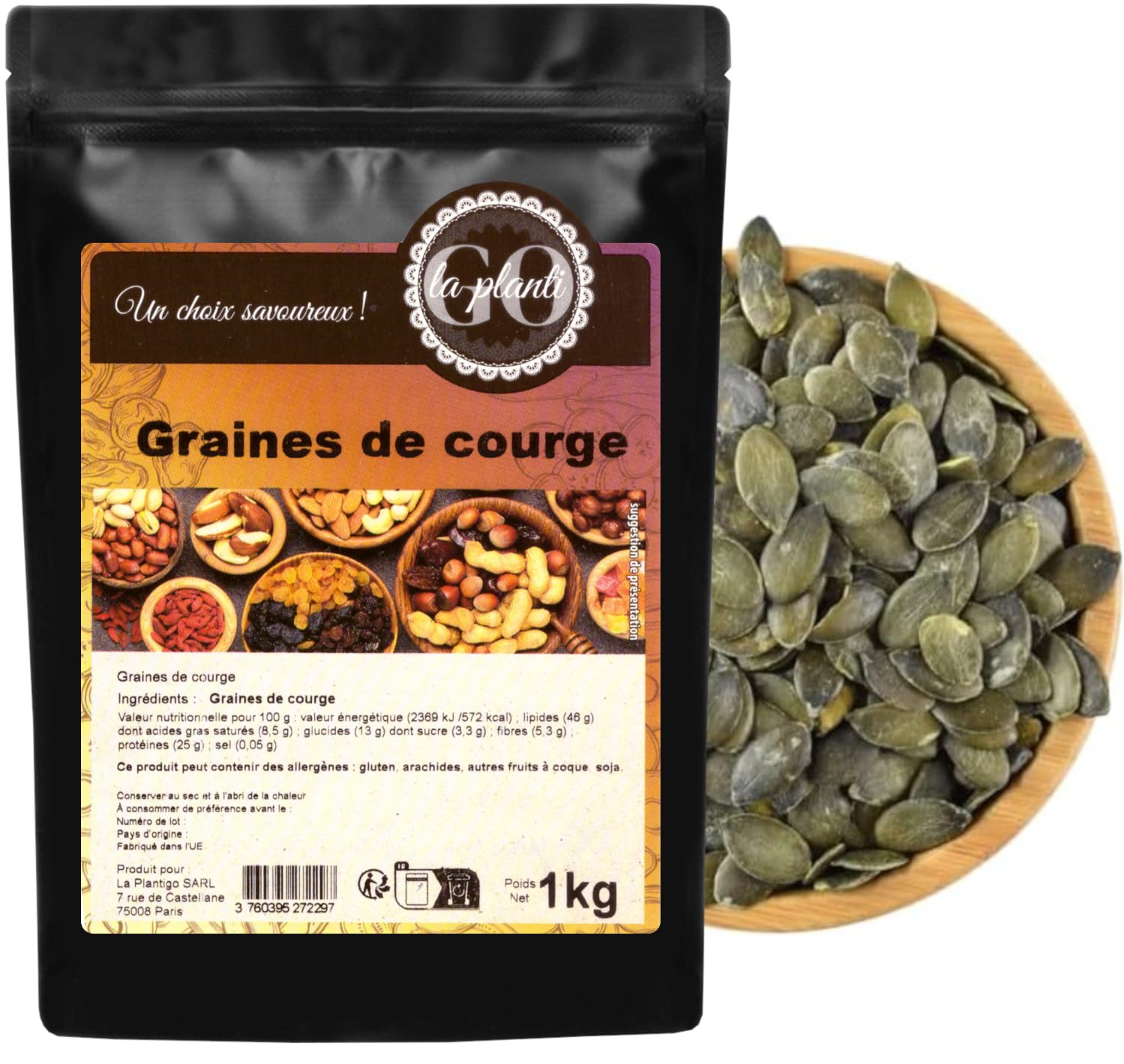 Ingredients: Pumpkin Seeds (100 ) Nutritional values per 100g of Pumpkin Seeds: Energy – 2369 kJ 572 kcal Fat – 46g of which saturates – 8.5g Carbohydrate – 13g of which sugars – 3.3g Fiber – 5.3g Protein – 25g Salt – 0.05g Nutritional values were calculated from raw material databases and specifications. Individual batches may vary slightly. Allergen Information: This product may contain the following allergens: gluten, peanuts, tree nuts, sesame, soy. Packaging Method: The product is packaged in thick, doypack-type pouches. The packaging has a heat-sealed drawstring closure, allowing for easy opening and resealing multiple times. Thanks to this simple technology, the product retains its freshness. Its organoleptic properties remain unchanged throughout its shelf life. Thanks to high sales volumes and our stock turnover, GOmigo products are always fresh, which encourages bulk purchases and stocking up on food in the home pantry. Ingredients: Pumpkin seeds (100 ) P.when('A').execute(function(A) { A.on('a:expander:toggle_description:toggle:collapse', function(data) { window.scroll(0, data.expander. expander[0].offsetTop-100) }) }) Instructions: Enjoy plain or pan-fried, with salt or sweet toppings. See moreThey're an ideal snack for when you have a sudden craving. They're delicious both plain and pan-fried, salted or sweetened. They're also an important ingredient in a vegetarian diet. Shelled pumpkin seeds are an excellent source of nutrients, minerals, antioxidants, and vitamins. Pumpkin seeds can be used as a delicious and nutritious snack or as an ingredient in everyday cooking: cereals, muesli, porridge, cottage cheese, vegetable soups, salads, raw vegetables, kasha, pasta, omelets, bread, cakes, or cookies.Description du produit Ingrédients : Graines de courge (100 ) Valeurs nutritionnelles pour 100 g de Graines de courge: Valeur énergétique – 2369 kJ 572 kcal Lipides – 46 g Dont acides gras saturés - 8,5 g Glucides – 13 g Dont sucres - 3,3 g Fibres – 5,3 g Protéines – 25 g Sel – 0,05 g Les valeurs nutritionnelles ont été calculées à partir de base de données et spécifications de matières premières. Les lots individuels peuvent varier légèrement. Information sur allergènes : Ce produit peut contenir les allergènes : gluten, arachides, fruit à coque, sésame, soja. Méthode d'emballage : Le produit est emballé dans des sachets épais de type « doypack ». L'emballage a une fermeture à cordon soudé, ce qui permet l'ouverture et la fermeture facile plusieurs fois. Grâce à cette technologie simple le produit garde sa fraicheur. Ses propriétés organoleptiques ne changent pas pendant toute la durée de conservation. Grâce aux volumes de ventes important et la rotation de nos stocks, les produits GOmigo sont toujours frais, ce qui favorise les achats en gros et le stockage des aliments dans le garde-manger à la maison. Ingrédients Graines de courge (100 ) P.when('A').execute(function(A) { A.on('a:expander:toggle_description:toggle:collapse', function(data) { window.scroll(0, data.expander. expander[0].offsetTop-100) }) }) Mode d'emploi Consommer nature ou grillée à la poêle, salées ou sucrées. Voir plusC'est un en-cas idéal en cas de fringale soudaine. Elles sont délicieuses aussi bien nature que grillées à la poêle, salées ou sucrées. Elles constituent également un ingrédient important du régime végétarien. Les graines de courge décortiquées sont une excellente source de nutriments, de minéraux, d'antioxydants et de vitamines. Les graines de courges sont utilisées comme un délicieux en-cas nutritif ou comme un ingrédients des préparations culinaires au quotidien : céréales, muesli, porridge, cottage cheese, soupes de légumes, salades, crudités, kashas, pâtes, omelettes, pain, gâteaux ou biscuits.Graines de courge 1 kg - LA PLANTIGO