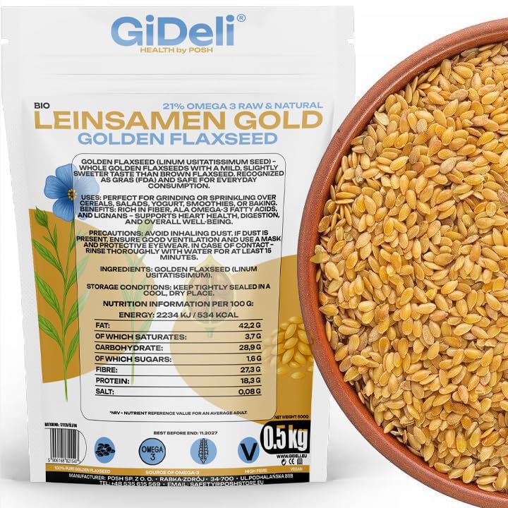 : These small golden seeds are a true treasure of nature, rich in fiber, omega-3 fatty acids, and lignans, which support digestion, help regulate cholesterol levels, and boost the immune system. They are perfect as an addition to yogurt, porridge, smoothies, or baked goods. This product comes from the highest quality crops it is natural, unprocessed, and free of any additives – ideal for vegans, vegetarians, and anyone committed to a healthy lifestyle. Ingredients: Golden Flax SeedsFreshly packaged – the airtight packaging protects against moisture and fully preserves nutritional value. For everyone – suitable for vegans and vegetarians, they support a healthy diet and promote good digestion. Versatile use – ideal for porridge, smoothies, baking, or as a salad topping. Nutrient-rich – contain fiber, omega-3 fatty acids, and lignans. Natural golden flax seeds – 100 pure, unprocessed, with no additives or preservatives.Description du produit Ces petites graines dorées sont un véritable trésor de la nature, riches en fibres, en acides gras oméga-3 et en lignanes, qui soutiennent la digestion, aident à réguler le taux de cholestérol et renforcent le système immunitaire. Elles sont parfaites comme ajout au yaourt, au porridge, aux smoothies ou aux produits de boulangerie. Ce produit provient de cultures de la plus haute qualité, il est naturel, non transformé et sans aucun additif – idéal pour les végétaliens, les végétariens et toutes les personnes soucieuses de mener une vie saine. Ingrédients Graines de Lin DoréEmballées fraîchement – l'emballage hermétique protège de l'humidité et préserve pleinement les valeurs nutritionnelles. Pour tous – adaptées aux végétaliens et végétariens, elles soutiennent une alimentation saine et favorisent une bonne digestion. Utilisation polyvalente – idéales pour le porridge, les smoothies, la pâtisserie ou comme garniture pour les salades. Riches en nutriments – contiennent des fibres, des acides gras oméga-3 et des lignanes. Graines de lin doré naturelles – 100 pures, non transformées, sans additifs ni conservateurs.Graines de Lin Doré Muesli aux graines de lin un complément alimentaire naturel et végan (500g)
