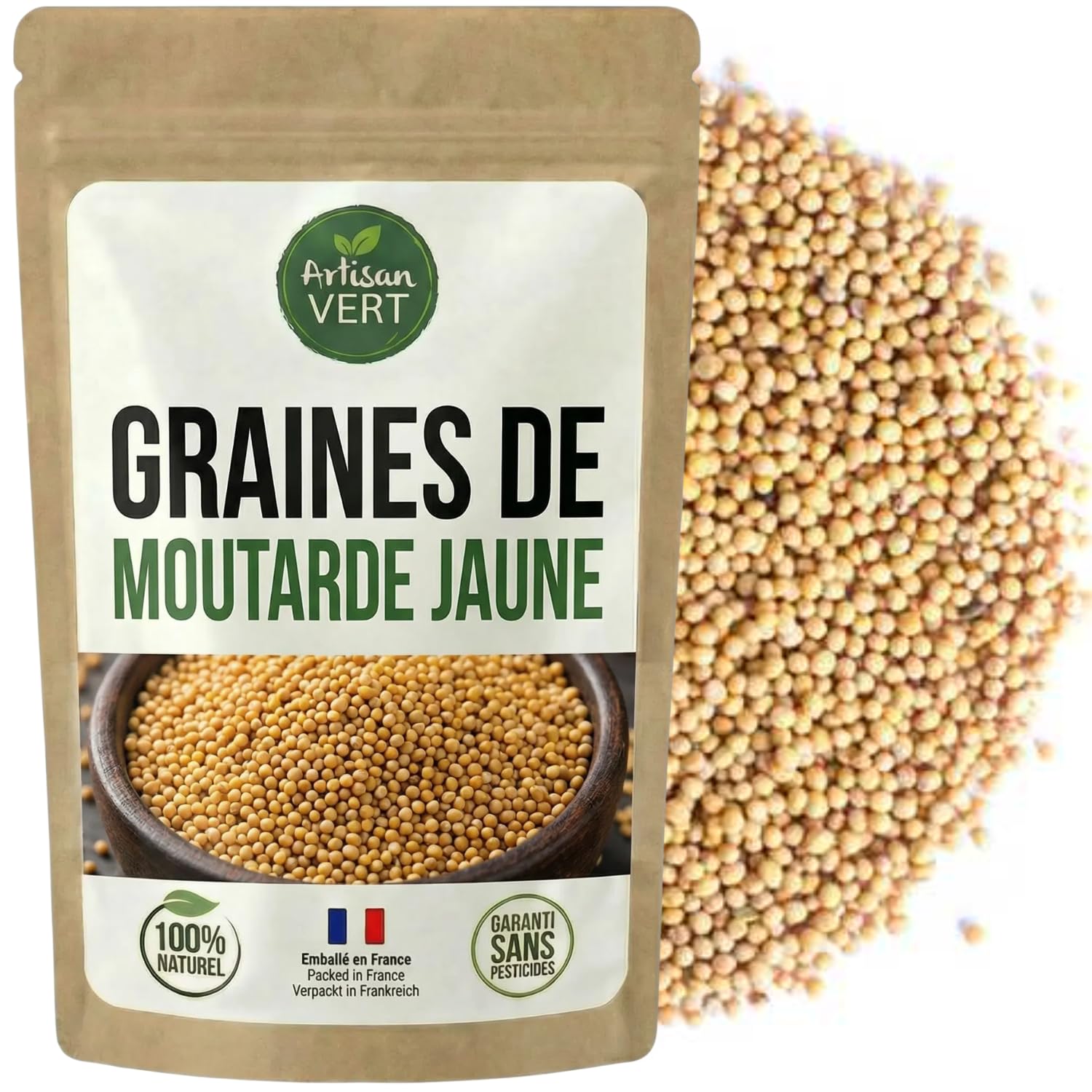 : L'Artisan du Vert Yellow Mustard Seeds are a mild, delicate, and essential spice in many cuisines around the world. From the Sinapis alba variety, they offer a more subtle and less pungent flavor than black or brown mustard, while retaining their slightly spicy and aromatic character. These seeds can be used in a multitude of ways: To create a mild homemade mustard, either grainy or blended, with vinegar, honey, oil, and herbs. In pickles, gherkins, vegetable preserves, or as a base for herb-infused vinegar. In cooking: lightly dry-roasted, they enhance stir-fries, root vegetables, cabbage, lentils, or fish. As an infusion or marinade, they infuse their warm and subtle notes into sauces, mayonnaise, or stews. Widely used in French, Northern European, and Indian cuisine, yellow mustard seeds are a simple, natural, and versatile ingredient. They are packaged without any additives, colorings, or preservatives, ready to be used as is, ground, or soaked. With L'Artisan du Vert, rediscover the taste of authentic recipes made with raw, effective, and natural ingredients. Instructions: To create a mild homemade mustard, grainy or blended, with vinegar, honey, oil, and herbs. In pickles, gherkins, jarred vegetables, or as a base for herb-infused vinegar. In cooking: lightly dry-roasted, they enhance stir-fries, root vegetables, cabbage, lentils, or fish. As an infusion or marinade, they infuse their warm and subtle notes into sauces, mayonnaise, or stews.100 Natural, No Additives or Preservatives: Raw, whole seeds, with no added salt, ready to use for artisanal cooking. Simple and Versatile Use: Toast, infuse, or grind as needed to enhance sauces, marinades, meats, or vegetables. Perfect for Pickles, Jarred Vegetables, Gherkins, and Fermented Condiments: A classic ingredient in natural preservation. Ideal for Making Mild Mustards and Homemade Vinegars: They pair wonderfully with vinegar, honey, or herbs for flavorful recipes. Whole Yellow Mustard – Mild and Aromatic: Untreated seeds with a subtly tangy flavor, ideal for refined homemade cooking.Description du produit Les Graines de Moutarde Jaune L'Artisan du Vert sont une épice douce, fine et incontournable dans de nombreuses cuisines du monde. Issues de la variété Sinapis alba, elles offrent une saveur plus délicate et moins piquante que la moutarde noire ou brune, tout en conservant leur caractère légèrement épicé et aromatique. Ces graines s'utilisent de multiples façons : Pour créer une moutarde douce maison, granuleuse ou mixée, avec du vinaigre, du miel, de l'huile et des aromates. Dans les pickles, cornichons, bocaux de légumes, ou comme base de vinaigre aromatisé aux herbes. En cuisson : légèrement torréfiées à sec, elles relèvent poêlées, légumes racines, choux, lentilles ou poissons. En infusion ou en marinade, elles diffusent leurs notes chaudes et subtiles dans les sauces, mayonnaises ou plats mijotés. Très utilisées dans la cuisine française, nord-européenne et indienne, les graines de moutarde jaune sont un ingrédient simple, naturel et polyvalent. Elles sont conditionnées sans aucun additif, ni colorant, ni conservateur, prêtes à être utilisées telles quelles, moulues ou trempées. Avec L'Artisan du Vert, retrouvez le goût des recettes authentiques à base de produits bruts, efficaces et naturels. Mode d'emploi Pour créer une moutarde douce maison, granuleuse ou mixée, avec du vinaigre, du miel, de l'huile et des aromates. Dans les pickles, cornichons, bocaux de légumes, ou comme base de vinaigre aromatisé aux herbes. En cuisson : légèrement torréfiées à sec, elles relèvent poêlées, légumes racines, choux, lentilles ou poissons. En infusion ou en marinade, elles diffusent leurs notes chaudes et subtiles dans les sauces, mayonnaises ou plats mijotés.100 Naturelles, Sans Additifs ni Conservateurs : Graines brutes, entières, sans sel ajouté, prêtes à l'emploi pour une cuisine artisanale. Utilisation Simple et Polyvalente : À toaster, infuser ou moudre selon vos besoins pour relever sauces, marinades, viandes ou légumes. Parfaites pour Pickles, Légumes en Bocaux, Cornichons et Condiments Fermentés : Un ingrédient classique de la conservation naturelle. Idéales pour la Préparation de Moutardes Douces et Vinaigres Maison : Se marient à merveille avec le vinaigre, le miel ou les herbes pour des recettes savoureuses. Moutarde Jaune Entière – Douce et Aromatique : Graines non traitées à la saveur subtilement piquante, idéales pour une cuisine maison tout en finesse.Graines de Moutarde Jaune – Moutarde Douce Entière 100 Naturelle – Pour Pickles, Vinaigres Aromatisés et Moutarde Maison – L'Artisan du Vert (250g)