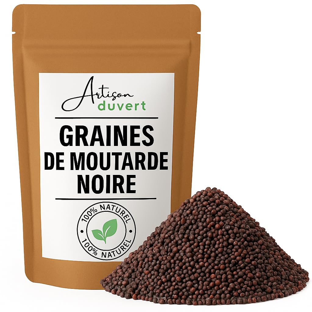 : L'Artisan du Vert Black Mustard Seeds are a raw and powerful ingredient, prized in kitchens around the world for their ability to transform a simple recipe into a dish full of character. They come from the Brassica nigra variety, renowned for its aromatic strength, natural spiciness, and rich fragrance. In both home and professional cooking, they are ideal for: Creating a rustic, grainy, old-fashioned mustard with vinegar, water, and a few spices. Adding depth to your pickles, chutneys, marinades, or fermented vegetables. Enhancing your stews, lentils, sauces, curries, or stir-fries of root vegetables or cabbage. Their flavor is released during cooking or infusion. You can lightly toast them in a pan to amplify their aroma, soak them to make a paste, or grind them to incorporate into homemade spice blends. Packaged without any processing, salt, or preservatives, these seeds are 100 natural, ready to use, and true to the spirit of simple, authentic, and flavorful cooking. Instructions: To make whole-grain mustard, mix the seeds with vinegar, water, salt, and spices. To enhance their aroma, lightly toast them in a pan. You can also soak them to make a paste.100 Natural, No Additives or Preservatives: A raw, pure, and versatile product, appreciated both in cooking and in artisanal processing. Toast, Soak, or Grind: The seeds reveal their full flavor once heated, infused, or crushed, depending on the recipe. Essential for Pickles, Gherkins, Fermented Cabbage, Marinades, and Jarred Vegetables: They pair wonderfully with acidic and aromatic preparations. Perfect for Creating Homemade Old-Fashioned Mustard: Mix with vinegar, water, salt, and spices for a grainy mustard with a robust flavor. Whole Black Mustard, Untreated: Brown to black seeds, rich in aroma, ideal for authentic and hearty cooking.Description du produit Les Graines de Moutarde Noire L'Artisan du Vert sont un ingrédient brut et puissant, prisé dans les cuisines du monde pour leur capacité à transformer une recette simple en préparation pleine de caractère. Elles proviennent de la variété Brassica nigra, reconnue pour sa force aromatique, son piquant naturel et sa richesse olfactive. En cuisine artisanale ou familiale, elles sont idéales pour : Créer une moutarde à l'ancienne, rustique et granuleuse, avec du vinaigre, de l'eau et quelques épices. Apporter du relief à vos cornichons, pickles, chutneys, marinades ou légumes fermentés. Relever vos plats mijotés, lentilles, sauces, currys ou poêlées de légumes racines ou de choux. Leur goût se libère à la cuisson ou à l'infusion. Vous pouvez les toaster légèrement dans une poêle pour amplifier leur parfum, les faire tremper pour préparer une pâte, ou les moudre pour intégrer dans des mélanges d'épices maison. Conditionnées sans traitement, sans sel, sans conservateurs, ces graines sont 100 naturelles, prêtes à l'emploi et fidèles à l'esprit d'une cuisine simple, authentique et savoureuse. Mode d'emploi Pour créer une moutarde à l'ancienne, mélanger les graines avec du vinaigre, de l'eau, du sel et des épices. Pour amplifier leur parfum, faites-les torréfier légèrement dans une poêle. Vous pouvez également les faire tremper pour préparer une pâte.100 Naturelles, Sans Additifs ni Conservateurs : Un produit brut, pur et polyvalent, apprécié aussi bien en cuisine qu'en transformation artisanale. À Toaster, Tremper ou Broyer : Les graines révèlent toute leur saveur une fois chauffées, infusées ou écrasées selon les recettes. Incontournables pour Pickles, Cornichons, Chou Fermenté, Marinades et Légumes en Bocal : Se marient à merveille aux préparations acides et aromatiques. Parfaites pour Créer une Moutarde à l'Ancienne Maison : À mélanger avec vinaigre, eau, sel et épices pour une moutarde granuleuse au goût puissant. Moutarde Noire Entière, Non Traitées : Graines brunes à noires, riches en arôme, idéales pour une cuisine authentique et généreuse.Graines de Moutarde Noire – Moutarde Brune Entière 100 Naturelle – Pour Cuisine, Pickles, Moutarde à l'Ancienne et Condiments – L'Artisan du Vert (100g)