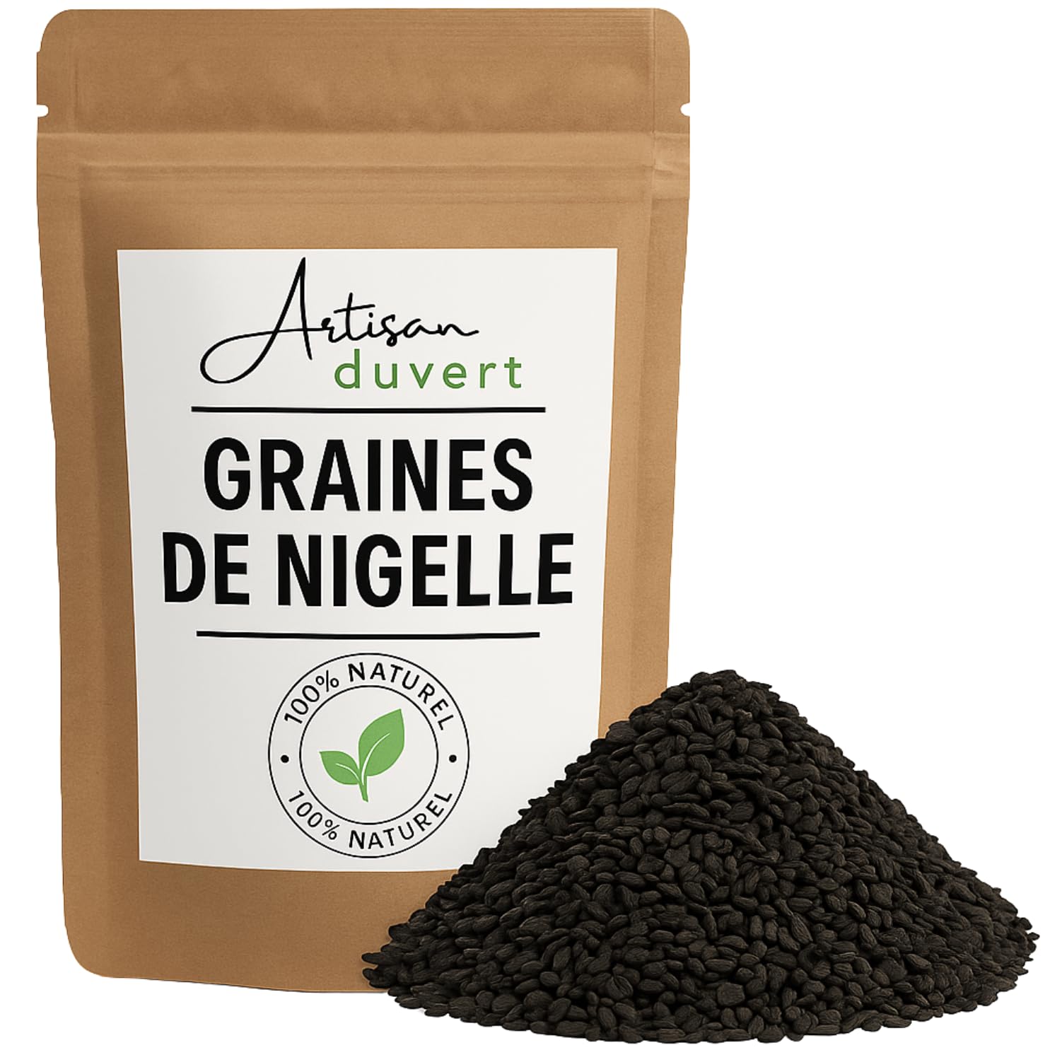 : L'Artisan du Vert Nigella Seeds are whole black seeds, also known as black cumin. Carefully harvested, they are prized for their slightly peppery, bitter, and spicy flavor, reminiscent of oregano or sweet pepper. Traditionally used in many cuisines around the world – Arabic, Indian, Turkish, Mediterranean – they are perfect for sprinkling on bread, cheeses, roasted vegetables, naan, or homemade flatbreads. They can also be incorporated into bread dough or sprinkled over hot or cold dishes just before serving. Presented in a 100g resealable bag, these nigella seeds have a long shelf life while retaining their strong, natural aroma. This product is 100 pure, untreated, and free of preservatives and additives. L'Artisan du Vert offers you an essential seed from world cuisine: simple, natural, and full of flavor. Ingredients: Nigella seedsNatural, Untreated Product: Raw seeds, without additives or preservatives – ready to use. 100g Resealable Bag: Convenient and clean format for long-term storage away from moisture. Sprinkle on Salads, Rice, Soups, and Cheeses: Adds character and a unique aroma to your homemade dishes. Ideal for Breads, Naans, and Savory Pastries: Widely used in Middle Eastern, Indian, and Mediterranean cuisine. 100 Pure Nigella Seeds: Also known as black cumin, these small black seeds are prized for their distinctive aroma and slightly bitter taste.Description du produit Les Graines de Nigelle L'Artisan du Vert sont des graines noires entières, aussi connues sous le nom de cumin noir. Récoltées avec soin, elles sont appréciées pour leur goût légèrement poivré, amer et épicé, qui rappelle celui de l'origan ou du poivre doux. Traditionnellement utilisées dans de nombreuses cuisines du monde – arabe, indienne, turque, méditerranéenne – elles sont parfaites pour parsemer sur du pain, des fromages, des légumes rôtis, des naans ou des galettes maison. Elles peuvent aussi être incorporées dans la pâte à pain ou saupoudrées sur des plats chauds ou froids juste avant de servir. Présentées en sachet refermable de 100g, ces graines de nigelle se conservent longtemps tout en gardant leur arôme puissant et naturel. Ce produit est 100 pur, sans traitement, sans conservateur ni additif. L'Artisan du Vert vous propose ici une graine essentielle de la cuisine du monde, simple, naturelle et pleine de goût. Ingrédients graines de nigelleProduit Naturel, Non Traité : Graines brutes, sans additifs ni conservateurs – directement prêtes à l'emploi. Sachet Refermable 100g : Format pratique et propre, pour une conservation longue durée à l'abri de l'humidité. À Saupoudrer sur Salades, Riz, Soupes, Fromages : Apportent du caractère et un parfum unique à vos plats maison. Idéales pour Pains, Naans, Pâtisseries Salées : Très utilisées dans la cuisine orientale, indienne et méditerranéenne. Graines de Nigelle 100 Pures : Aussi appelées cumin noir, ces petites graines noires sont appréciées pour leur arôme distinctif et leur touche légèrement amère.Graines de Nigelle 100g – Graines Noires Naturelles pour Cuisine, Pains et Saupoudrage – Pures et Aromatiques – L'Artisan du Vert