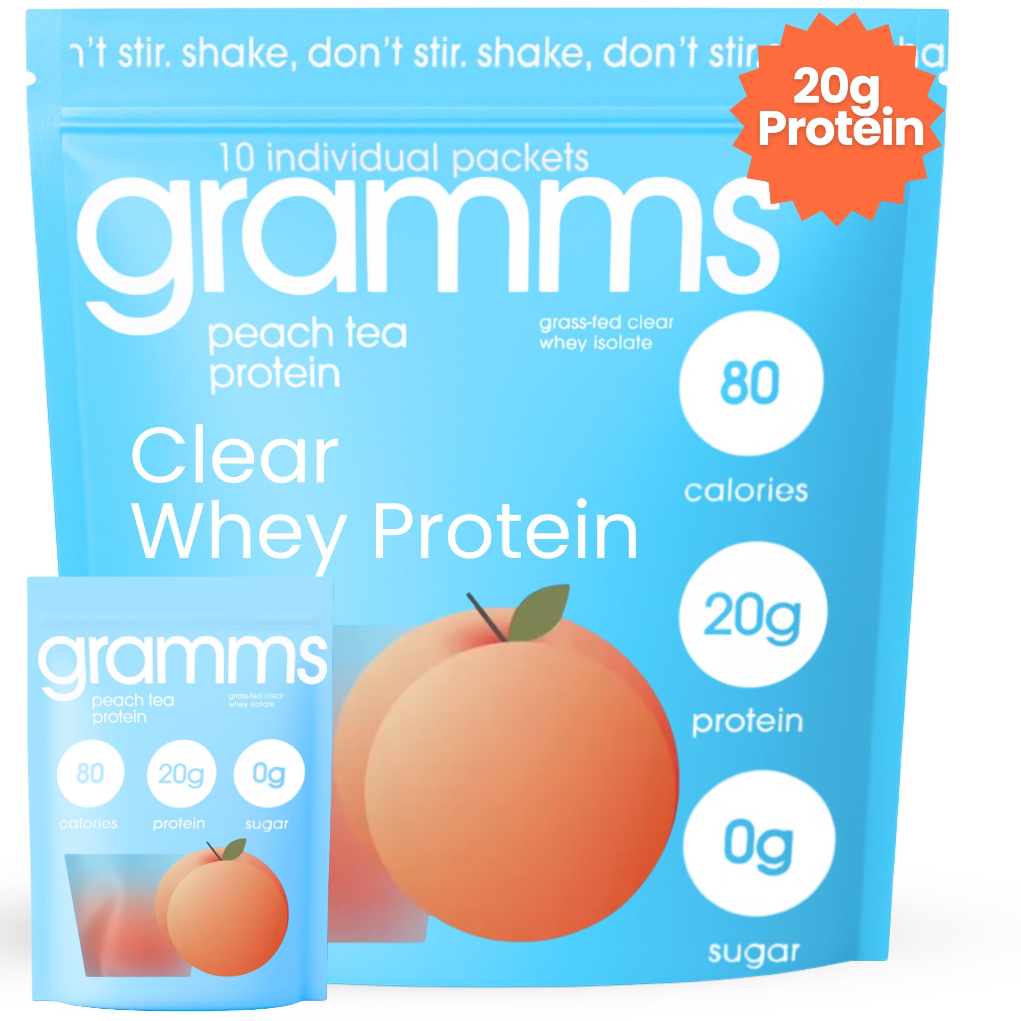 GRAMMS Clear Protein Powder Packets 20G Protein for Women & Men | Lactose Free Grass-Fed Whey Isolate Gluten Free Zero Sugar Gut Friendly Non-Bloating (10 Servings) Peach Tea