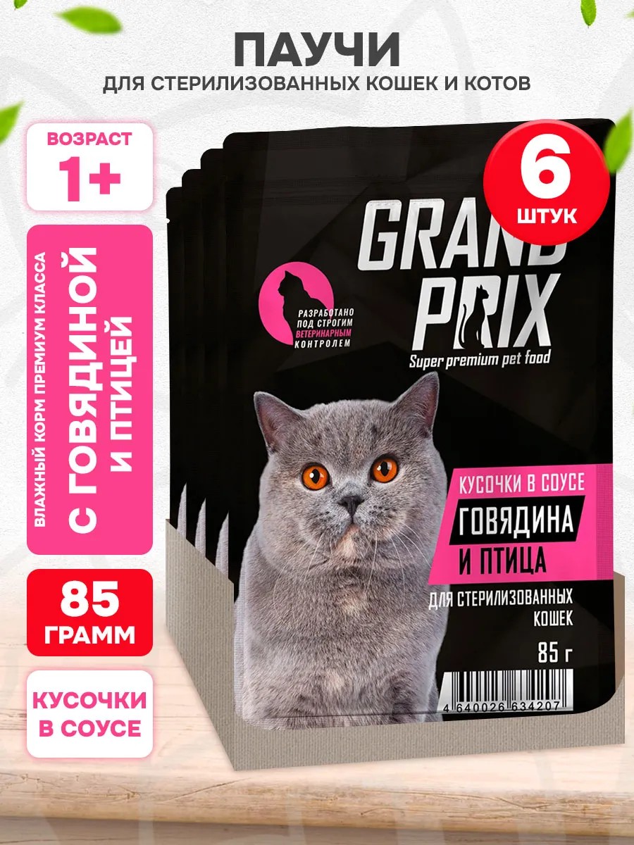 Нежные кусочки говядины и птицы в аппетитном соусе - это полноценное сбалансированное питание премиум-класса для вашей кошки. Влажный корм для кошек Grand Prix объединяет отличный вкус и сбалансированный питательный состав, созданный с учетом потребностей домашних животных.